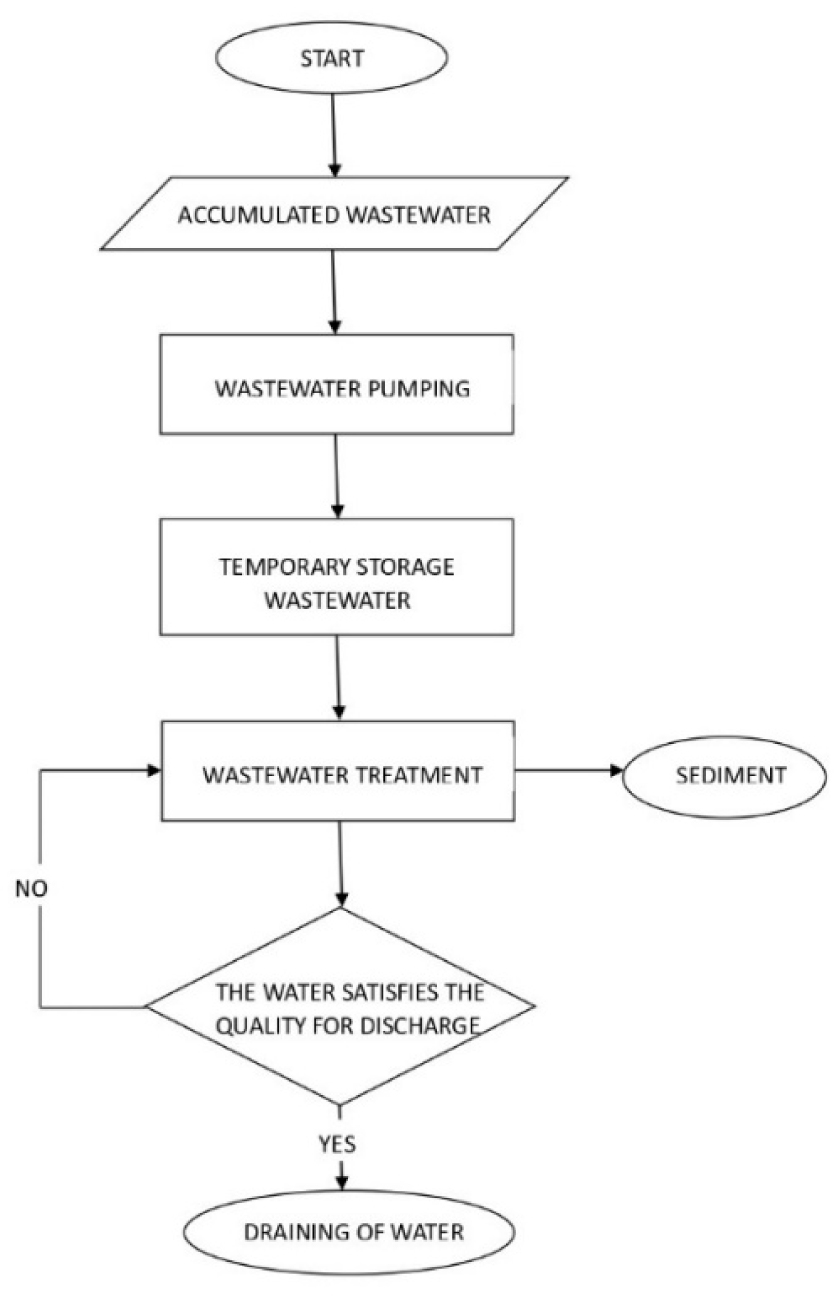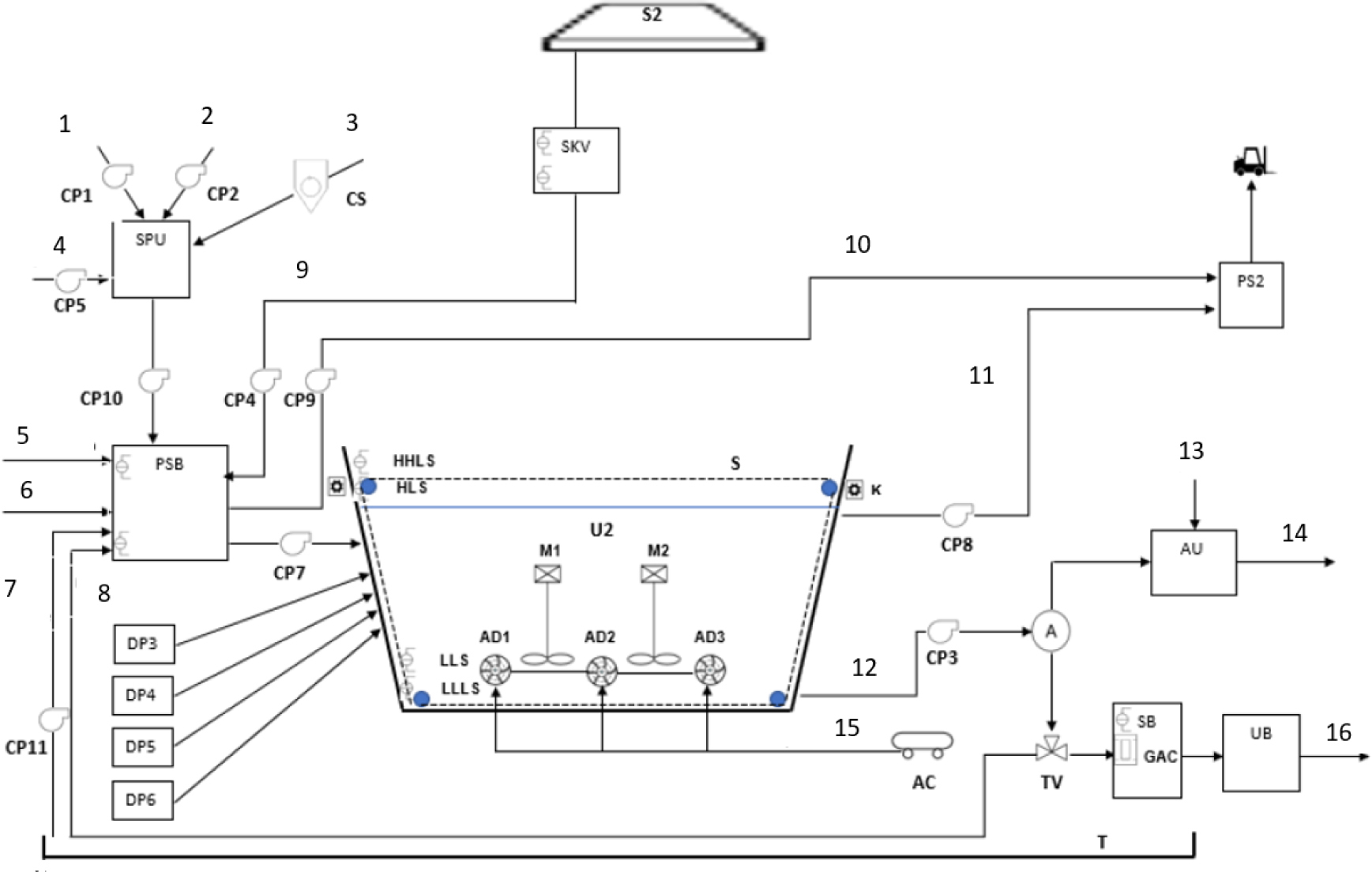 The treated wastewater stream is discharged into the collection basin (SB), whose entrance is fitted with a GAC filter to reduce the slightest chance of the appearance of harmful substances. If the wastewater quality does not satisfy national regulatory conditions (compatible with EU legislation) for input into the SB, the stream is returned to the PSB tank for reprocessing.