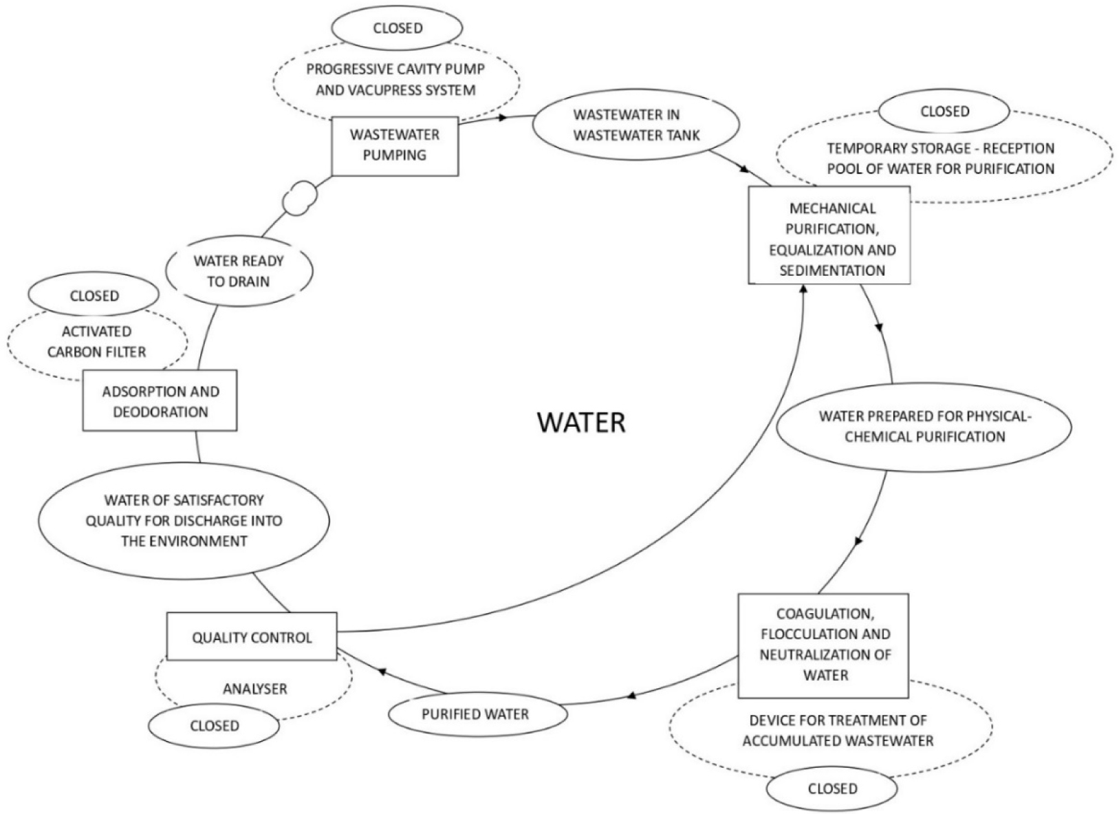 After excretion, accumulated water is transferred to the receiving pool. From there, it is sent to flocculation, coagulation, neutralisation, and equalisation in a discontinuously operated vessel equipped with a computer system for dosing coagulants, flocculants, and organic and inorganic neutralisation agents. The container (device), in addition to the dosing system for the mentioned substances, will be equipped with aeration discs, skimmers, and an analyser that will discharge the treated water into the recipient via a triple valve or in the case of insufficient quality, it will be returned to the treatment process.