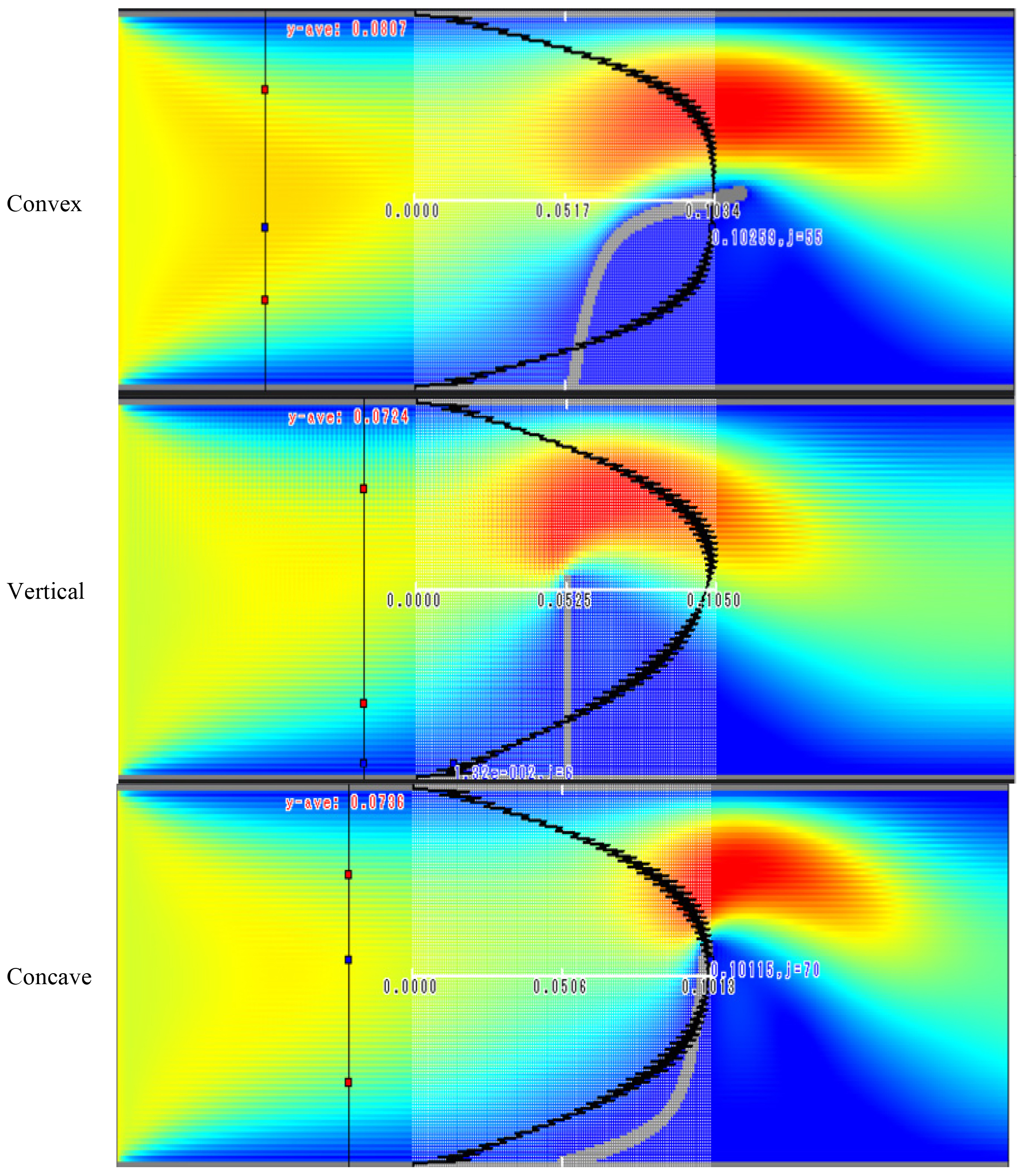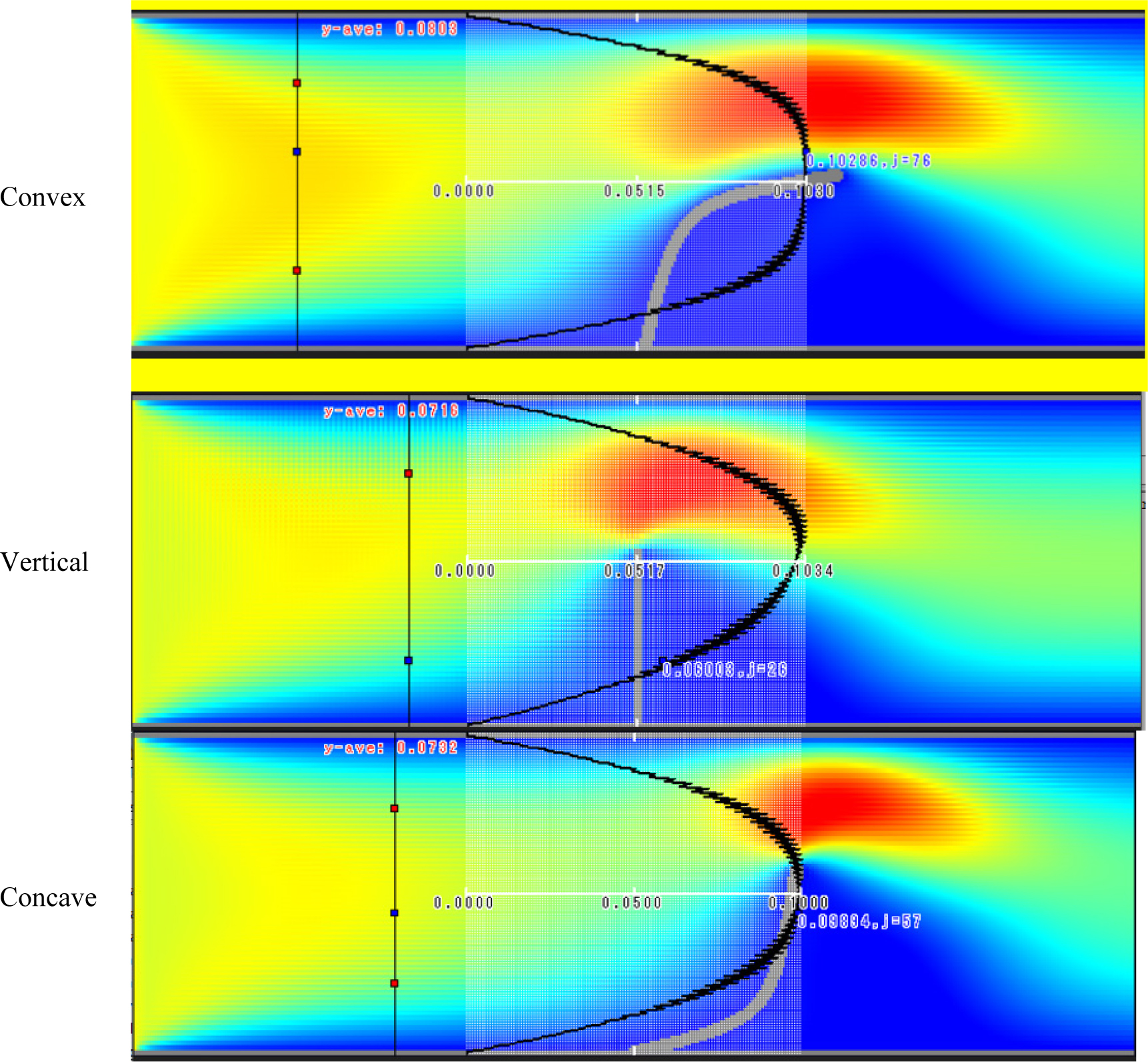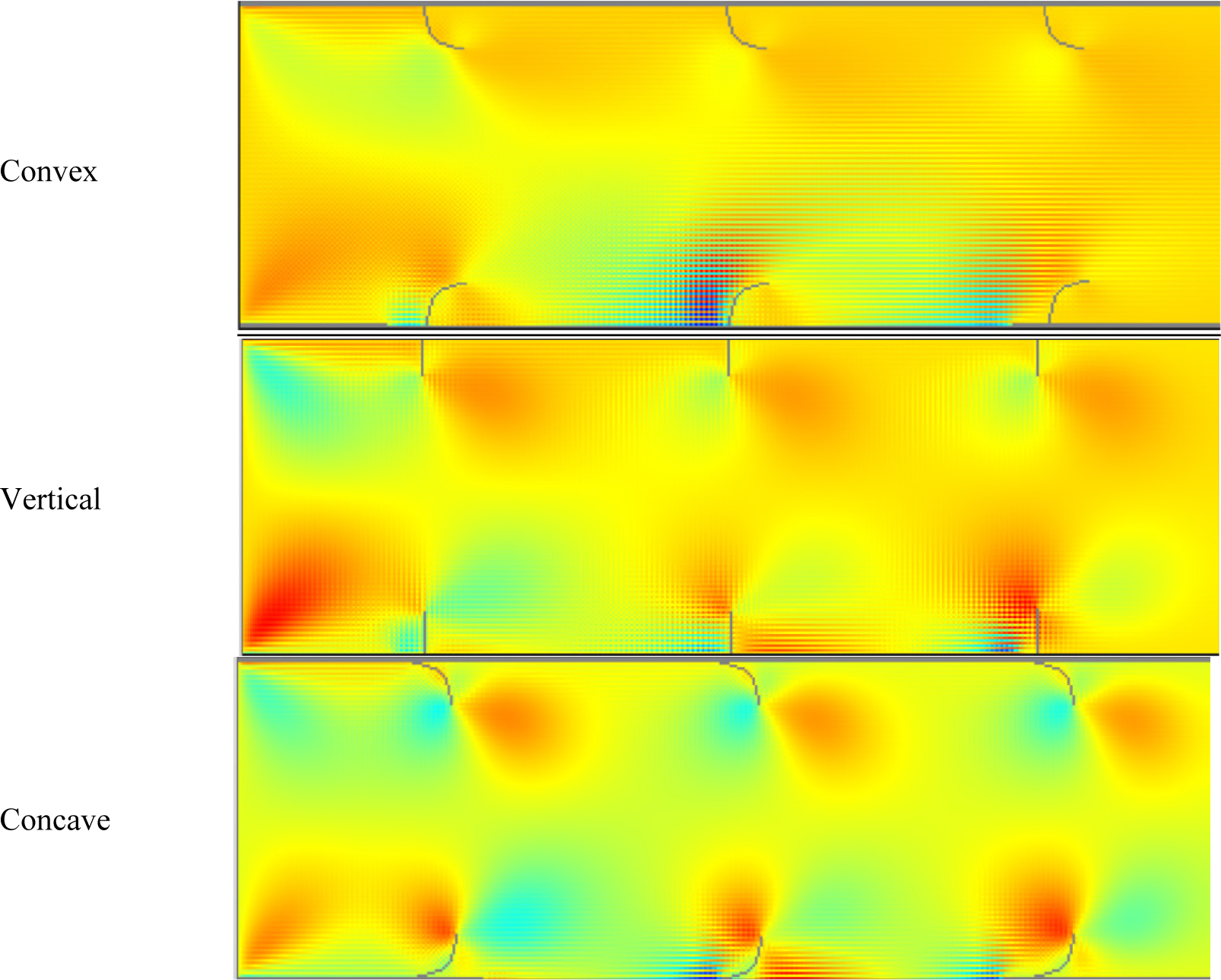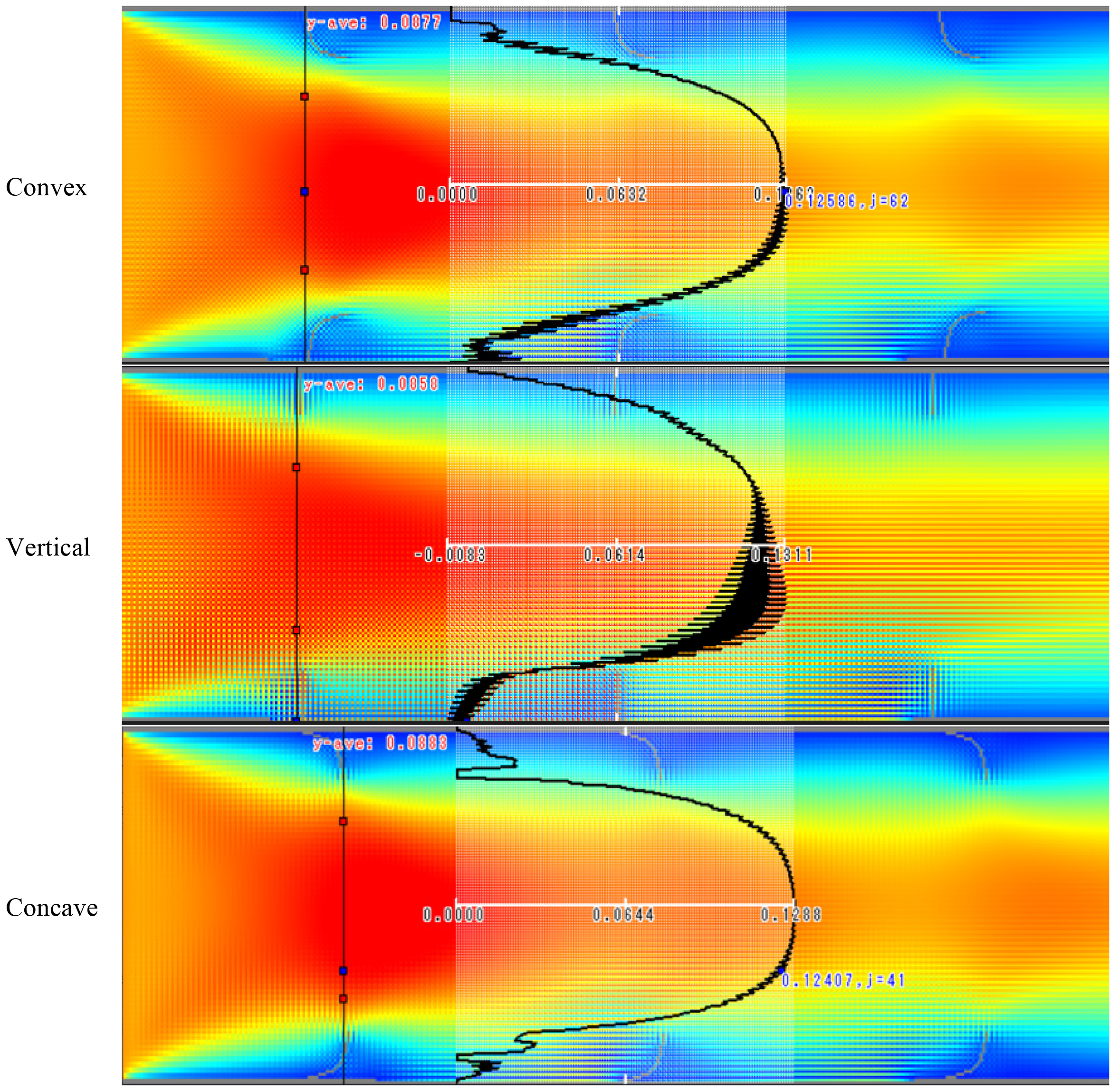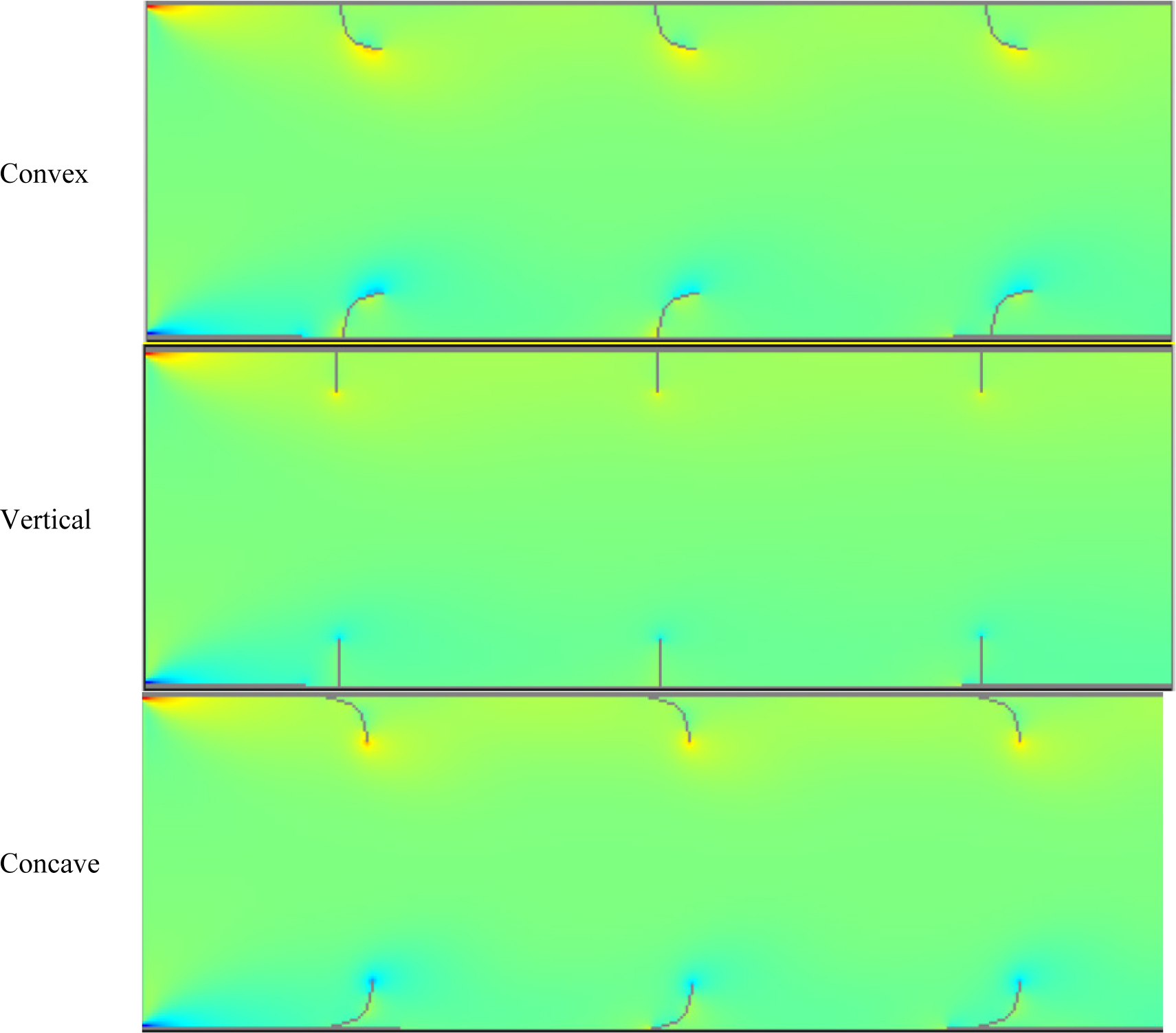 Stable flow control: The concave shape provides a smoother and more consistent flow profile with reduced turbulence, as evidenced by more uniform velocity and pressure distributions across all graphs. This situation leads to better flow stability and efficiency than convex and vertical shapes, which exhibit more fluctuations and localised disturbances.