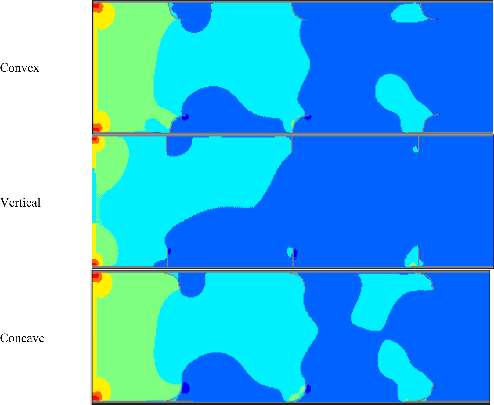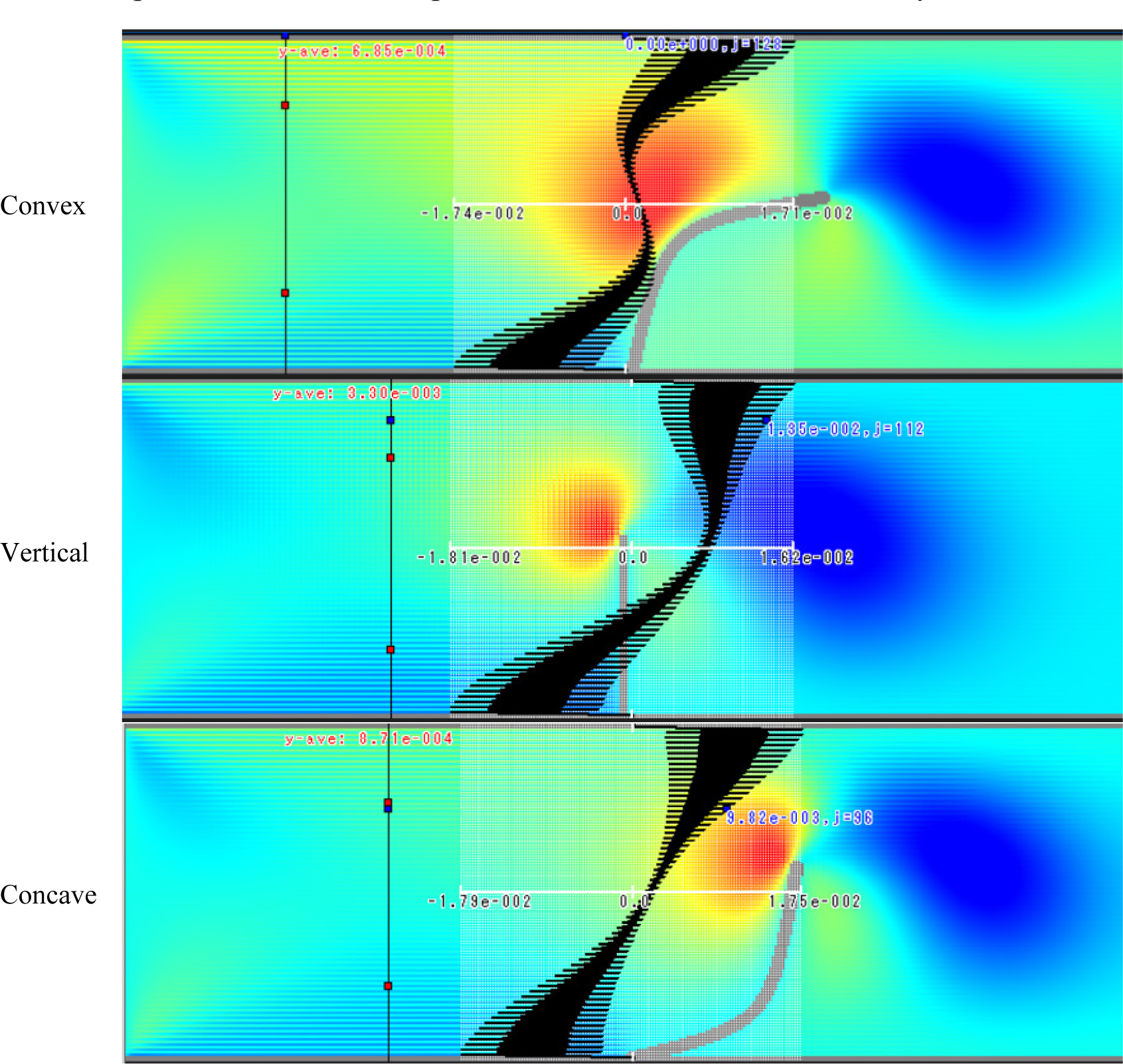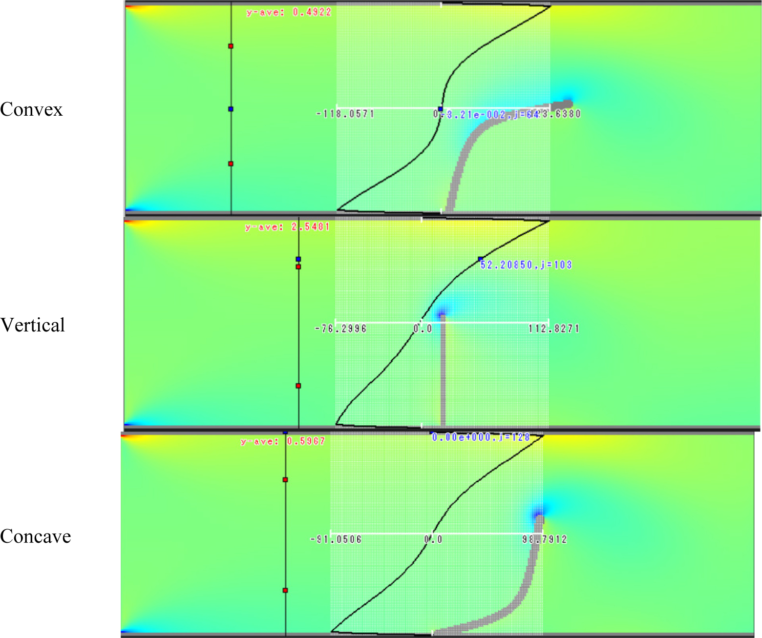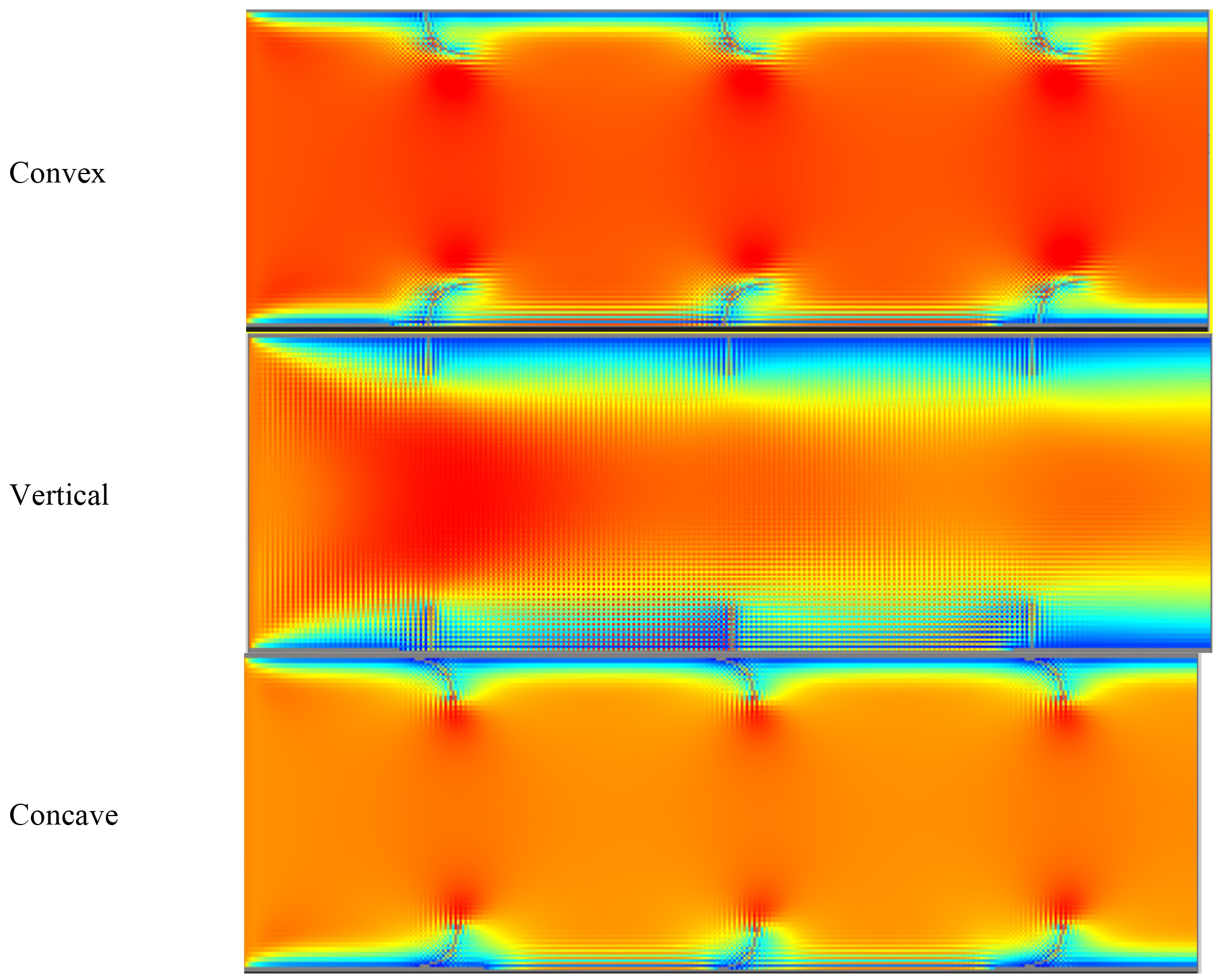Stable flow control: The concave shape provides a smoother and more consistent flow profile with reduced turbulence, as evidenced by more uniform velocity and pressure distributions across all graphs. This situation leads to better flow stability and efficiency than convex and vertical shapes, which exhibit more fluctuations and localised disturbances.