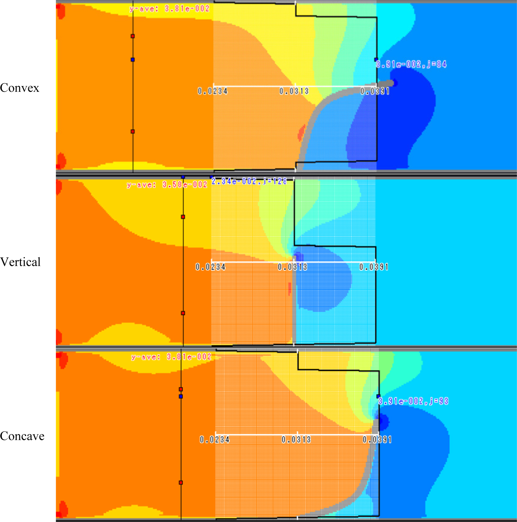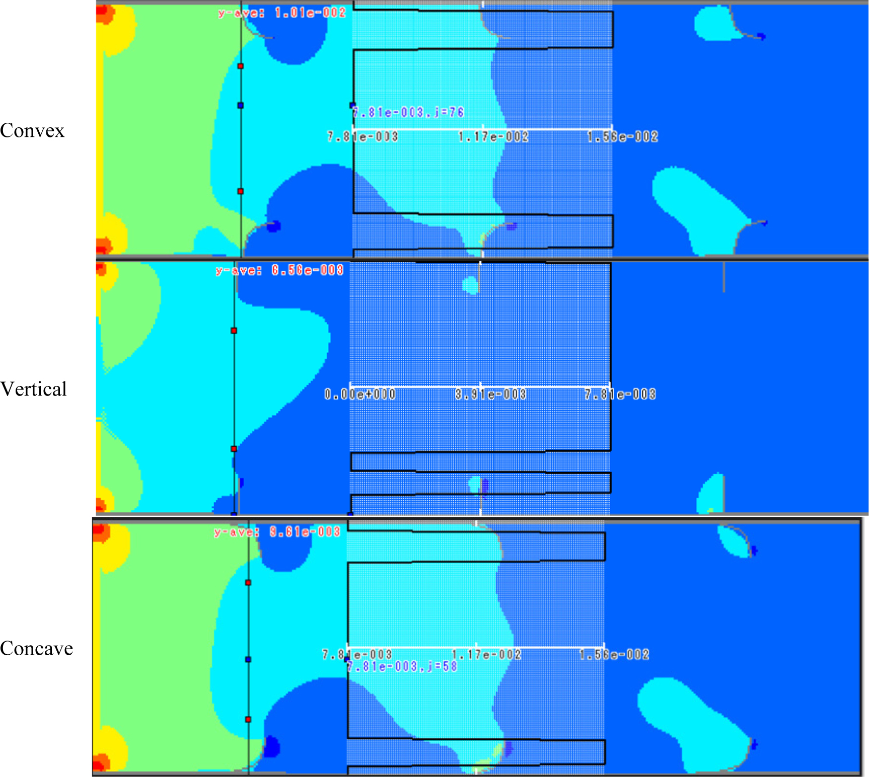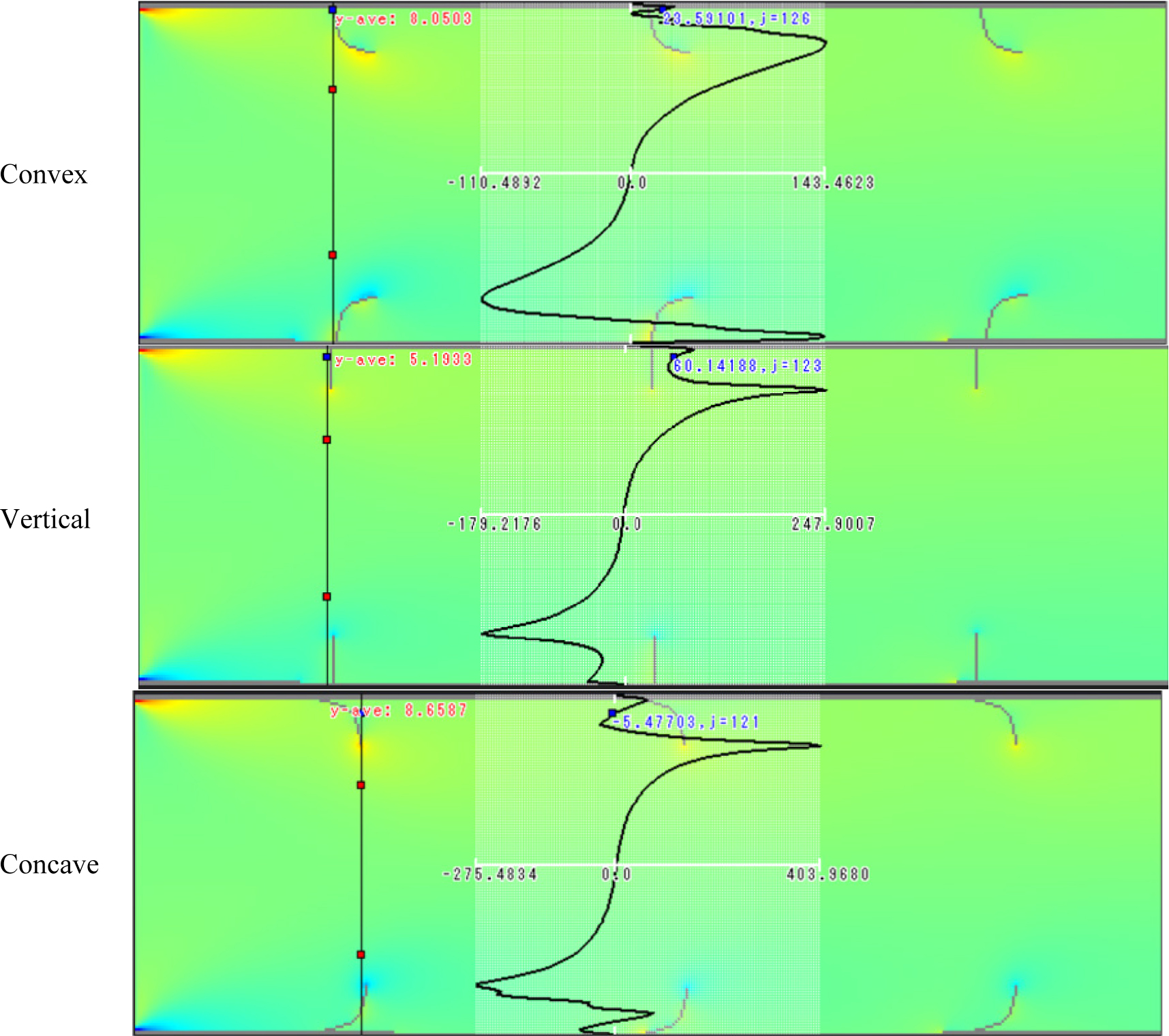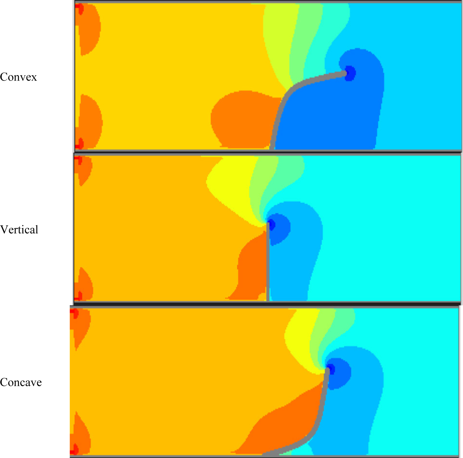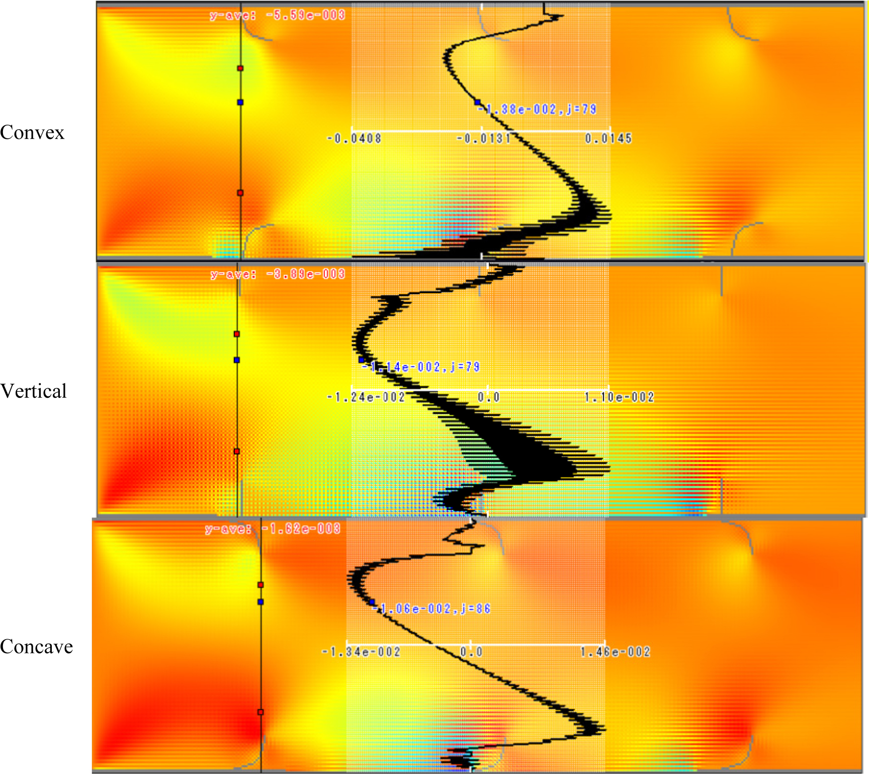 Stable flow control: The concave shape provides a smoother and more consistent flow profile with reduced turbulence, as evidenced by more uniform velocity and pressure distributions across all graphs. This situation leads to better flow stability and efficiency than convex and vertical shapes, which exhibit more fluctuations and localised disturbances.
