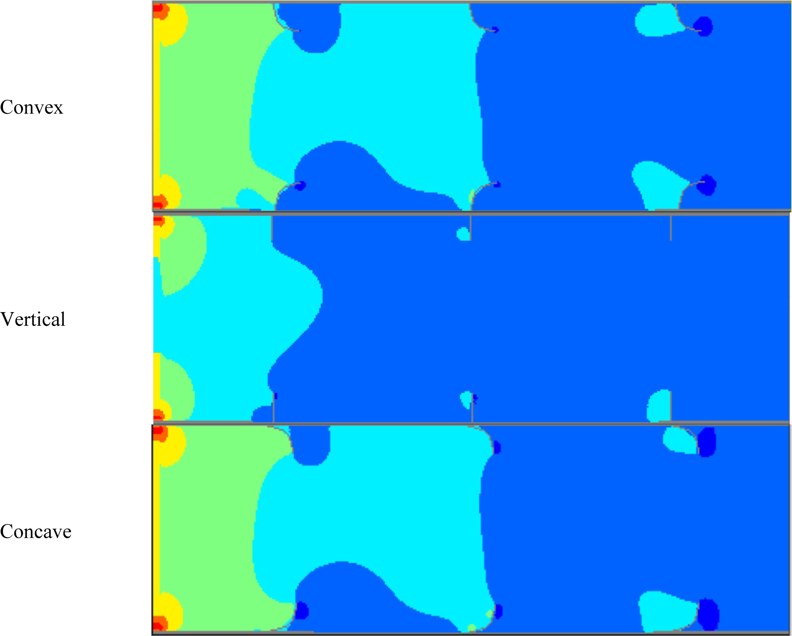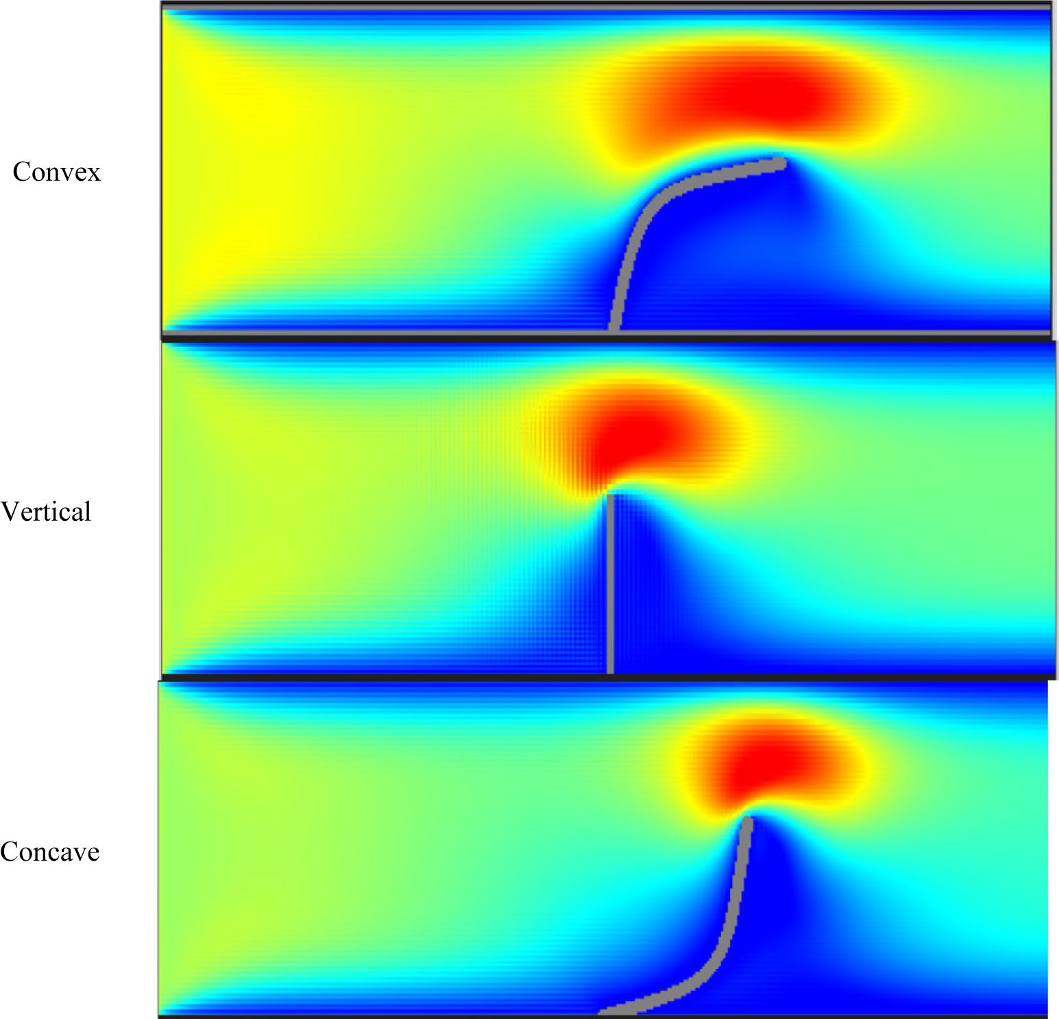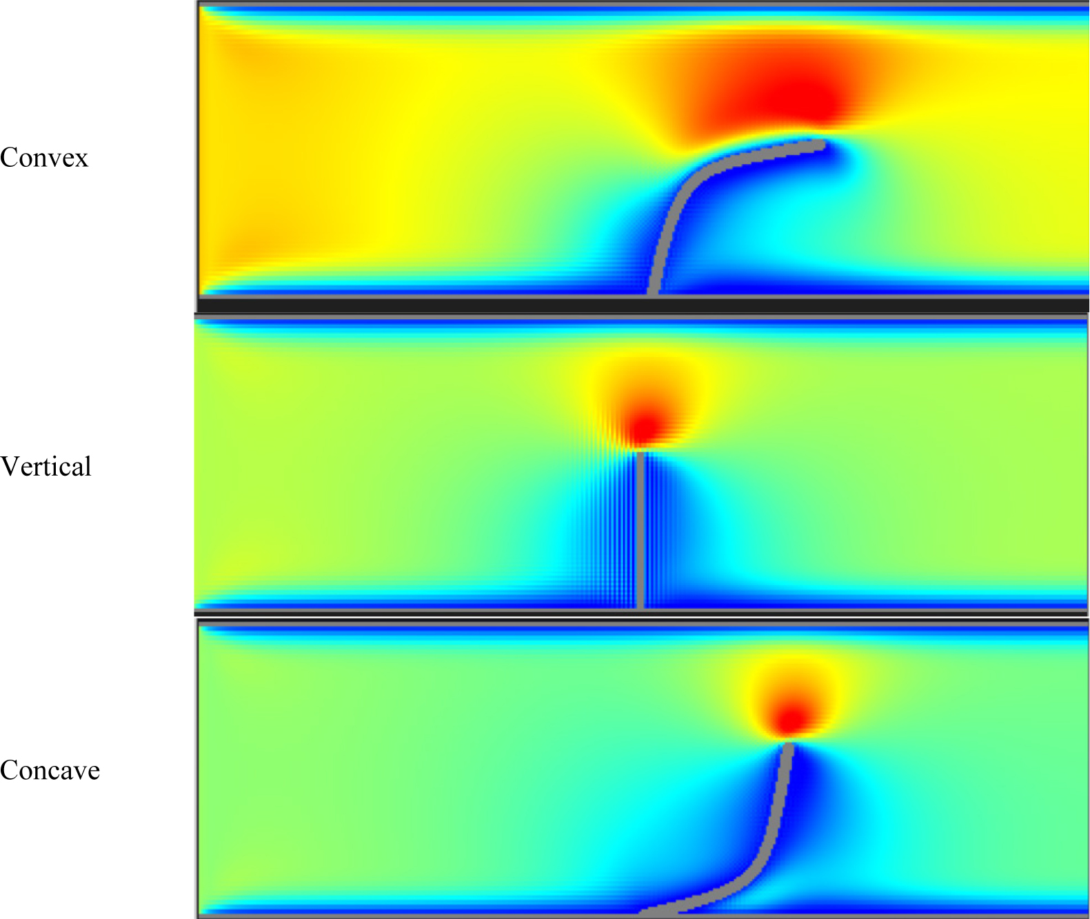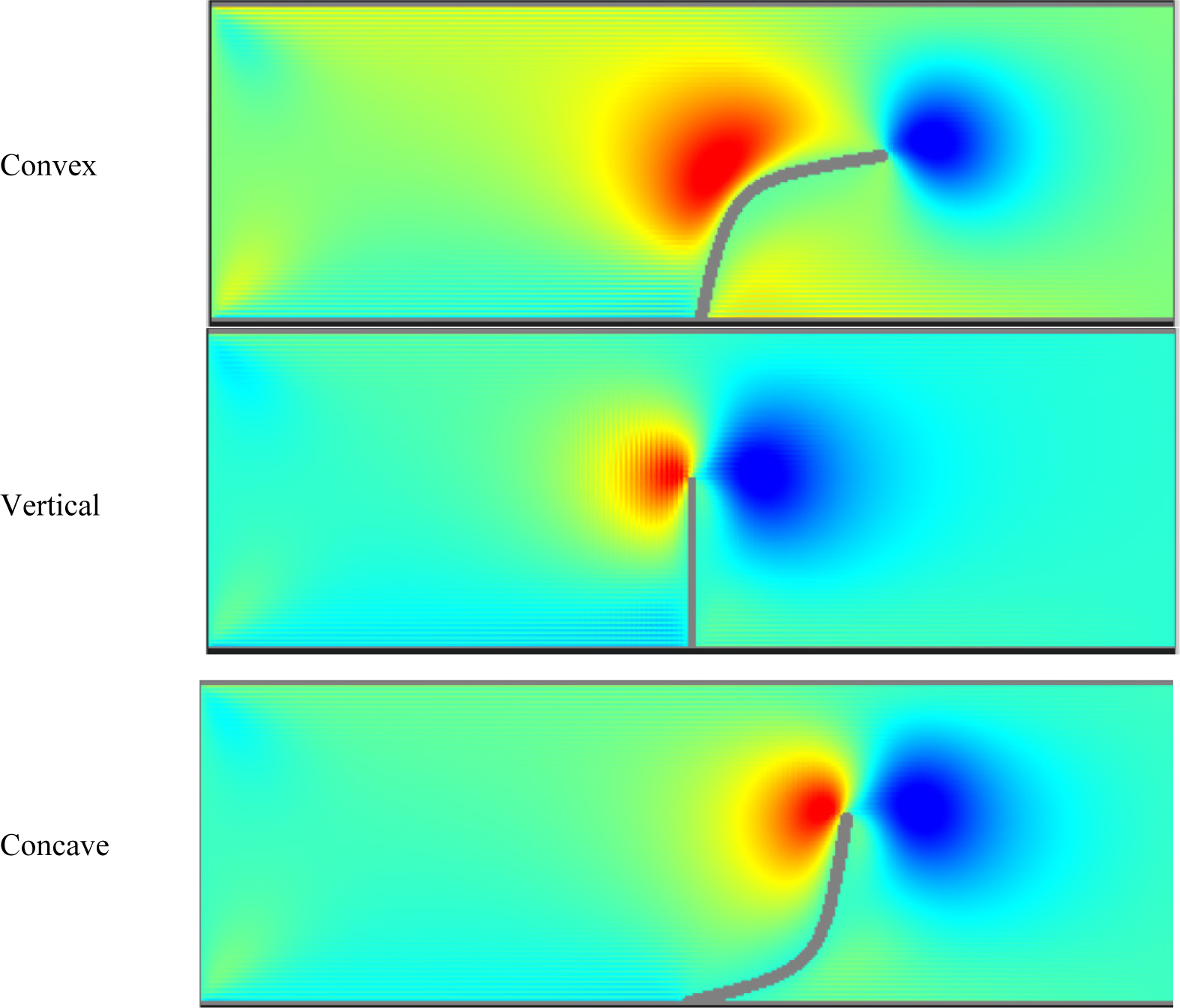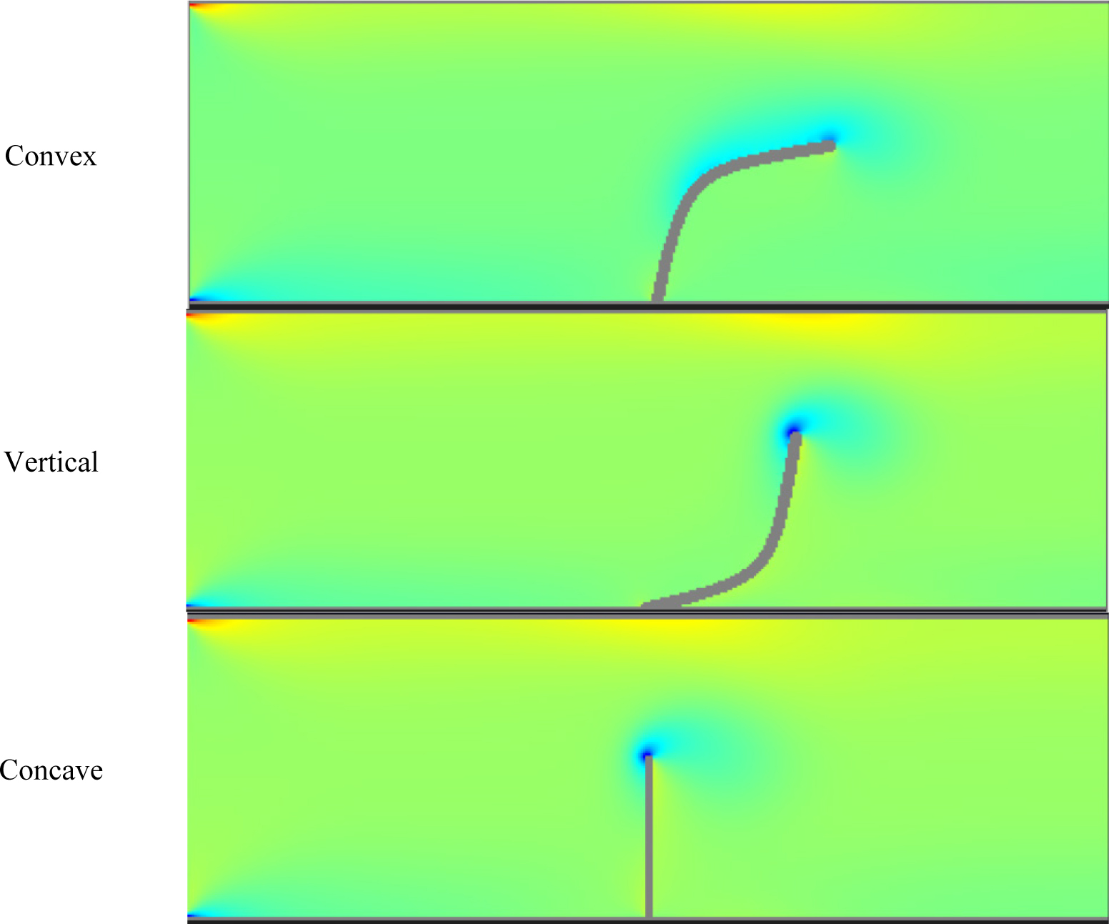 Reduced turbulence: Unlike the convex and vertical shapes, which show localised turbulence, the concave blade reduces disturbances and maintains smoother flow dynamics, ensuring more effective control over the fluid.