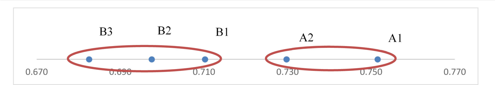 Figure 2 shows the group classification of the five key factors extracted from the previous study based on the similarity of the Grey relation value of F3 "Resource recovery and reuse" and F1 "Energy-efficient lighting and equipment". In this case, these two key factors were grouped into cluster A. F3 "Resource recovery and reuse" was re-coded as A1, and F1 "Energy-efficient lighting and equipment" was re-coded as A2 according to the degree of importance, followed by F4 "Energy-saving behaviour and awareness enhancement", F6 "Energy efficiency optimisation", and F7 "Energy-saving policies and management", for which the difference in the Grey relation value was no more than 0.015. Therefore, the previous study classified these three key factors into cluster B, re-coding F4 "Energy-saving behaviour and awareness enhancement" as B1, F6 "Energy efficiency optimisation" as B2, and F7 "Energy-saving policies and management" as B3 according to the degree of importance. Following the above criteria, Figure 2 finally presents the status of the five key factors after classification.