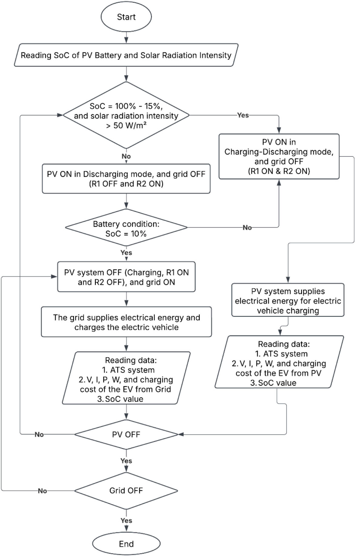 The method and system design of the proposed solution are described in this section, detailing both the operational logic and the physical components of the integrated solar PV and grid-connected system. The operational workflow is illustrated in Figure 1, which presents a structured decision-making process implemented in the Raspberry Pi using a rule-based control logic coded in Python. The system operates continuously with a 5-second refresh interval, enabling real-time responses to changing environmental and load conditions. It monitors two critical parameters: solar irradiation intensity and battery state of charge (SoC). When the SoC is within the optimal range (between 100%–15%) and solar irradiance exceeds 50 W/m2, the system operates in a charging-discharging mode, directly supplying energy for EV charging while disabling the grid connection. If the SoC drops to a critical threshold of 10%, the system deactivates PV utilization and enables grid power through an Automatic Transfer Switch (ATS), ensuring uninterrupted energy supply while preventing deep discharge conditions that may shorten battery lifespan. Additionally, the system halts charging when SoC exceeds 95% to avoid overcharging. This priority logic ensures that solar energy is maximally utilized while maintaining battery health and overall system stability.