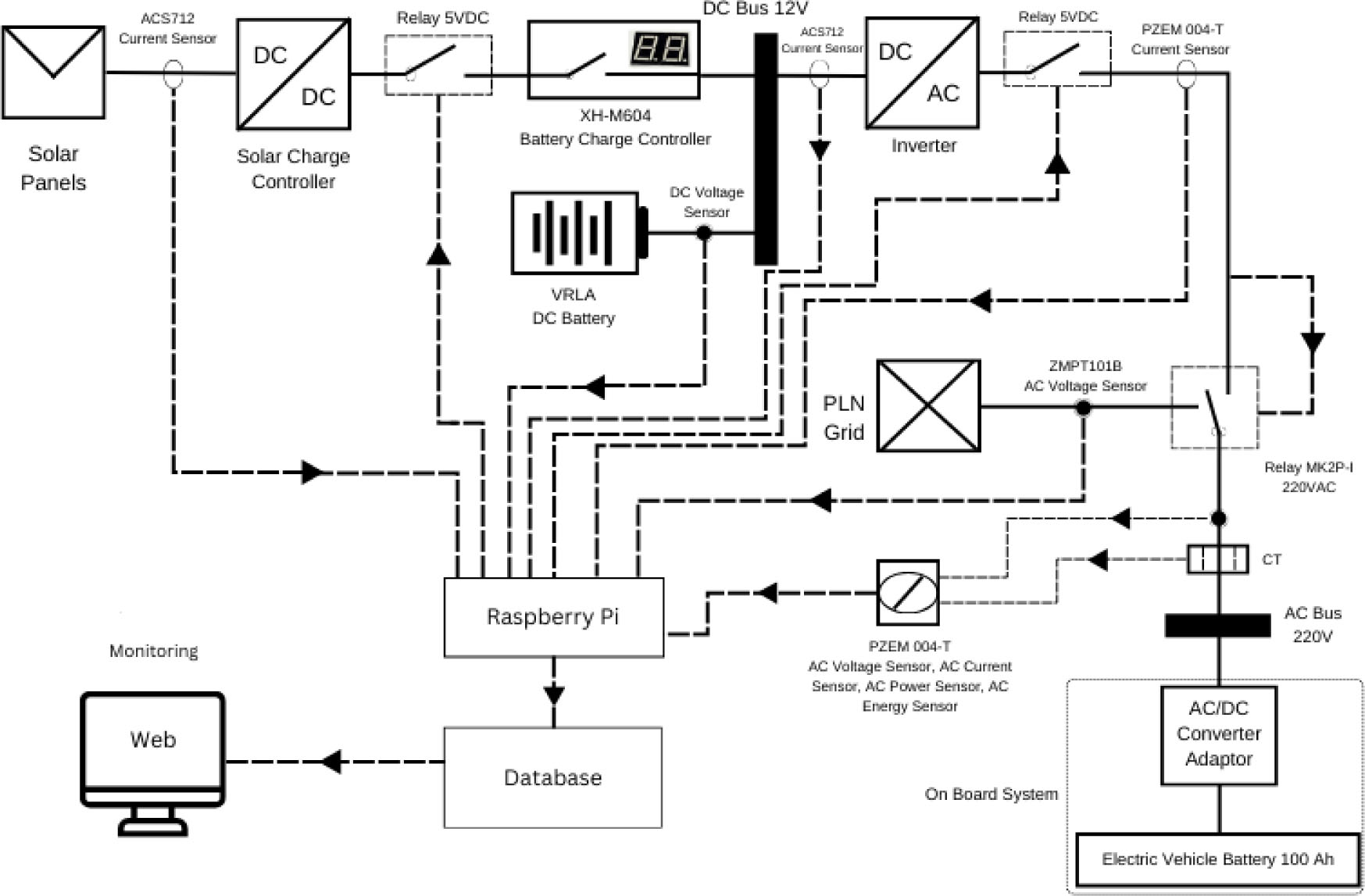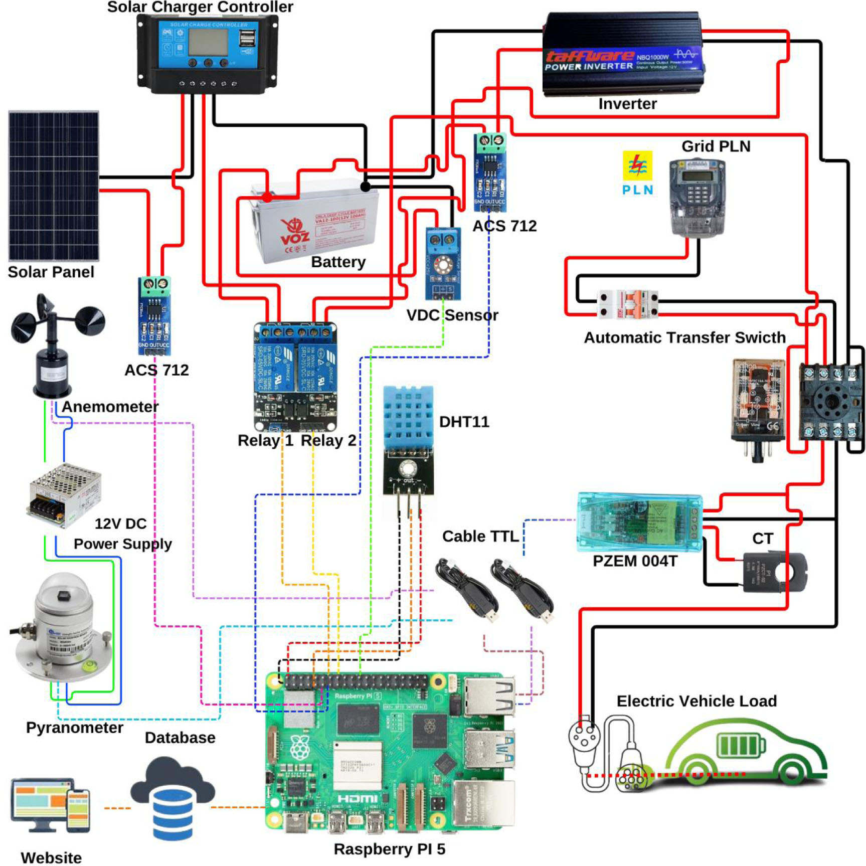 Building upon this framework, the system incorporates an array of sensors and control mechanisms to optimize energy flow and ensure seamless operation. As depicted in Figure 3, the Raspberry Pi 5 functions as the central hub, managing data acquisition from key sensors, including ACS712 for current measurement, a VDC sensor for voltage monitoring, and PZEM-004T for tracking power, energy, and electricity costs during EV charging. The integration of a pyranometer and anemometer further enhances system intelligence by providing real-time environmental data, ensuring that energy production forecasts align with prevailing solar and wind conditions. A DHT11 sensor is also employed to monitor ambient temperature and humidity, parameters that influence battery efficiency and overall system performance.