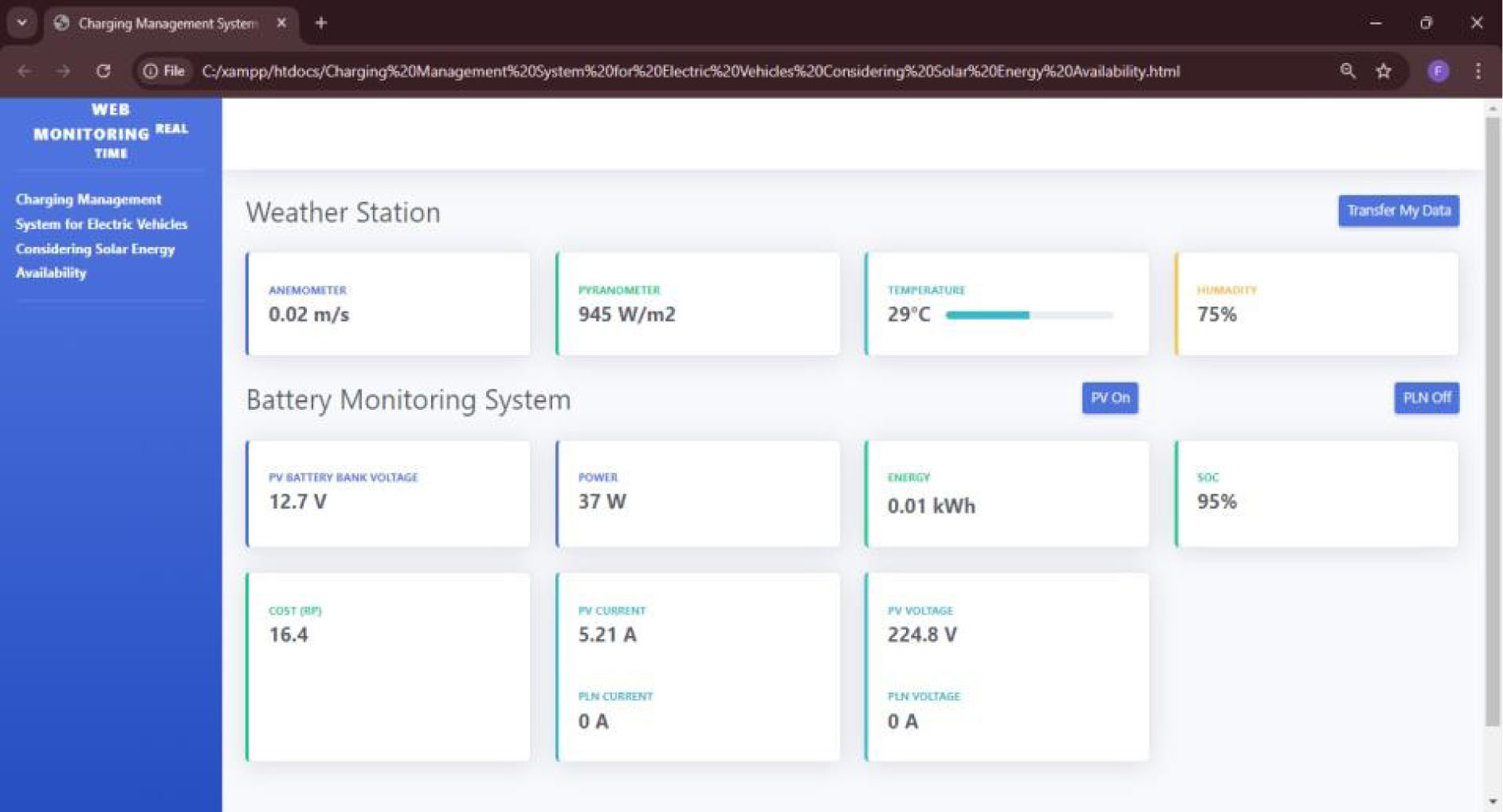 The results of this study demonstrate the successful implementation of a real-time web-based monitoring and control system for EV charging, utilizing Raspberry Pi 5 as the central processing unit. As illustrated in Figure 4, the web-based dashboard provides a user-friendly interface that displays real-time data on both weather conditions and the battery monitoring system, ensuring comprehensive supervision of the charging process. Key parameters such as solar irradiation (945 W/m2), wind speed (0.02 m/s), temperature (29°C), humidity (75%), and battery state of charge (95%) are continuously monitored and displayed. The system also tracks PV voltage (224.8 V), PV current (5.21 A), power consumption (37 W), and energy usage (0.01 kWh), allowing users to make informed decisions regarding energy consumption and system efficiency.