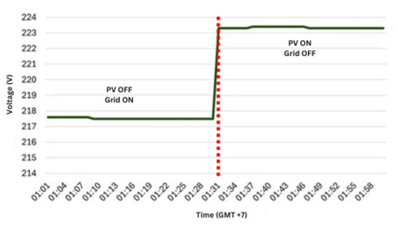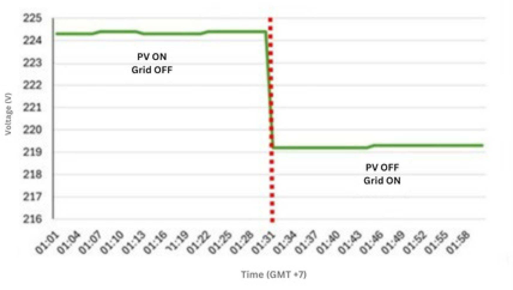 A shift from the grid to the PV system produces the opposite effect, demonstrating the PV system's ability to maintain a higher and more stable voltage. Initially, with the grid supplying power, the voltage remains at approximately 218 V. At 01:31 (GMT+7), the PV system takes over, resulting in a sharp voltage increase to around 224 V. This transition, depicted in Figure 6, showcases the PV system’s superior voltage regulation compared to the grid. The smooth stabilization after the switch reinforces the PV system’s reliability, highlighting its capability to provide a more stable power supply with minimal fluctuations.