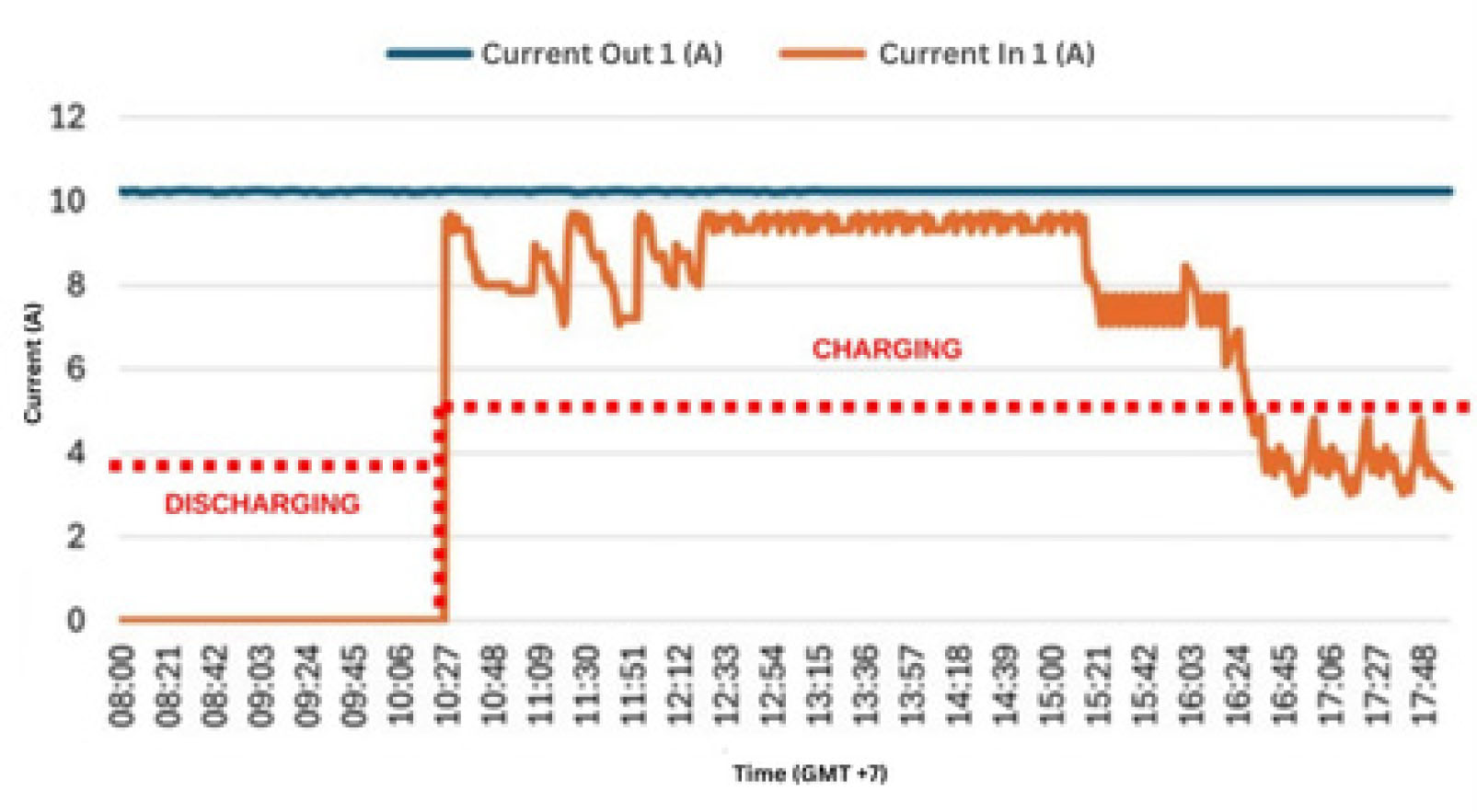 Battery performance during charging and discharging is crucial for evaluating system efficiency. Initially, the battery is in a discharging state, with a stable current output of approximately 0 A. However, at 10:27 (GMT+7), as shown in Figure 7, the system transitions to charging mode, resulting in a significant increase in input current, peaking around 10 A. This indicates a rapid energy intake as solar power becomes available. The current remains relatively stable throughout the charging period, ensuring efficient energy absorption. However, after 15:00, the charging current begins to fluctuate and gradually decreases, reflecting the declining availability of solar energy as the day progresses.