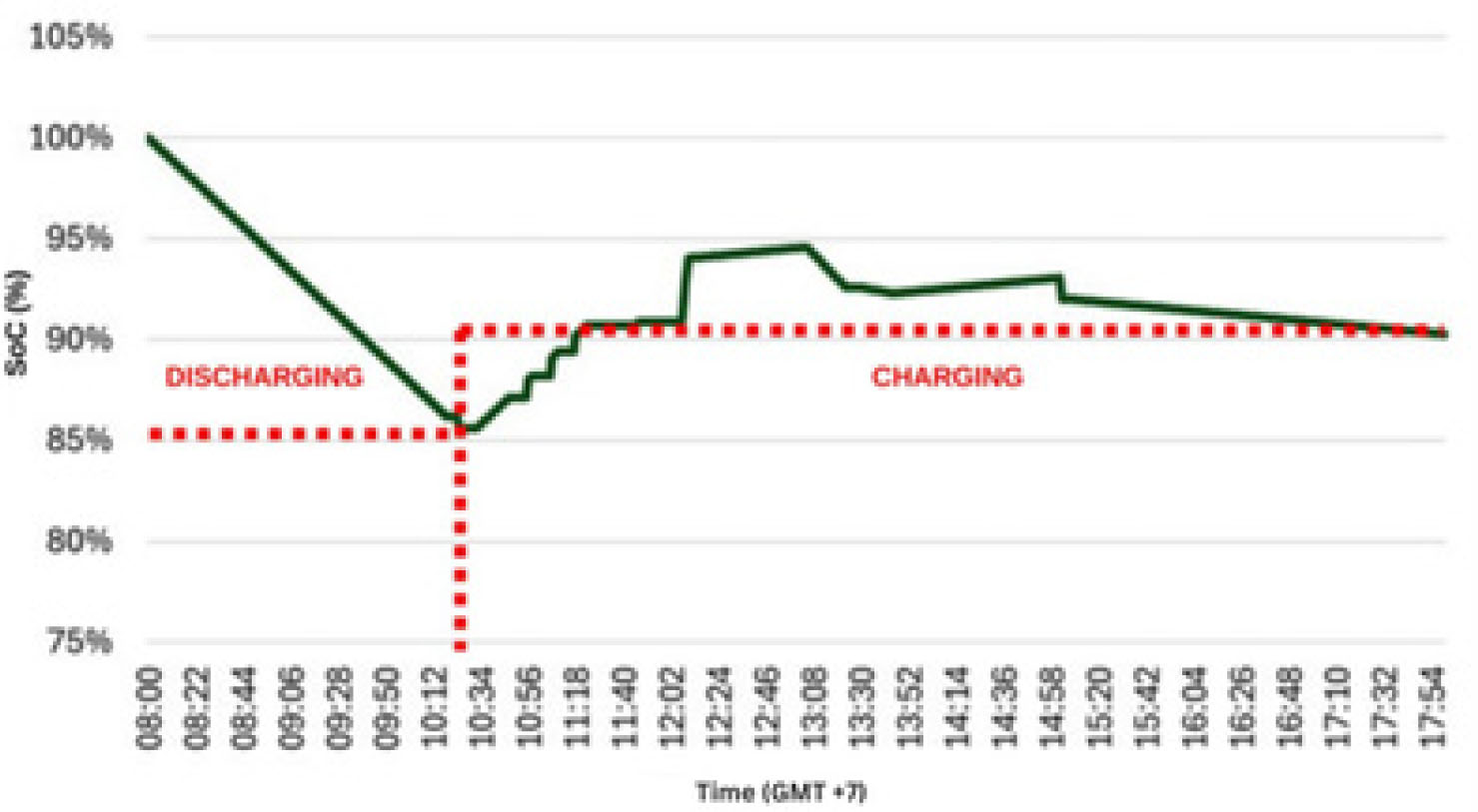 State of Charge behavior further confirms the battery’s charging and discharging patterns. Initially, the SoC declines steadily, reaching approximately 85% due to continuous discharging. At 10:12 (GMT+7), as depicted in Figure 8, the charging phase begins, leading to a gradual recovery in SoC. The battery regains its charge, stabilizing around 90%–95% throughout the midday period. Minor fluctuations in SoC suggest intermittent variations in solar power input. Later in the afternoon, the charging rate slows, and the SoC stabilizes before slightly decreasing, indicating reduced solar energy input and the transition toward evening discharge. These findings emphasize the effectiveness of solar charging while highlighting the dependency on solar availability.