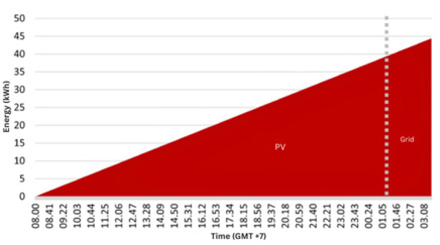 The efficient management of battery charging and discharging plays a crucial role in ensuring optimal energy utilization, as previously demonstrated by the current and SoC analysis. The gradual charging process throughout the day allows the system to store sufficient energy, which is later utilized during periods of low solar availability. Figure 9 further reinforces this by illustrating the accumulation of energy primarily from the PV system, with a steady increase in stored energy until around 01:46 (GMT+7). At this point, the PV system is no longer capable of sustaining the load, and the grid takes over to maintain power availability. This transition underscores the importance of a well-managed storage system to maximize solar energy utilization and minimize dependence on the grid.