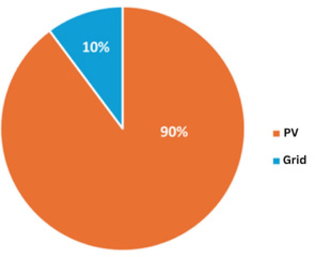 The effectiveness of PV integration in reducing grid reliance is evident when analyzing overall energy consumption. As seen in Figure 10, the PV system contributes 90% of the total energy supply, while only 10% is drawn from the grid. This high percentage of solar energy usage aligns with the stable SoC behavior observed earlier, confirming that the battery effectively stores and distributes energy throughout the day. The minimal reliance on the grid highlights the success of the PV system in sustaining power demands, further emphasizing the importance of optimizing solar energy storage to enhance energy independence. These findings collectively demonstrate how efficient battery management, stable SoC performance, and strategic energy distribution work together to maximize the benefits of solar power. While the proposed system demonstrates effective performance in a small-scale, building-level implementation, its scalability to larger applications warrants further consideration. In larger systems such as residential clusters, commercial facilities, or public charging networks several challenges may arise, including increased data traffic, latency in communication, and the need for more robust control algorithms. Additionally, geographic and climatic variability, such as differences in solar irradiance across regions or seasonal changes, may affect PV generation consistency and battery utilization strategies. To address these challenges, the current IoT framework can be enhanced through the integration of edge computing to process data locally and reduce latency, as well as AI-based forecasting methods to predict solar generation and load demand. Moreover, a modular system design would allow for easier expansion and adaptation to diverse deployment environments. Future studies should evaluate the system’s performance in various climatic zones and explore interoperability with utility-scale demand response programs to assess its broader applicability.
