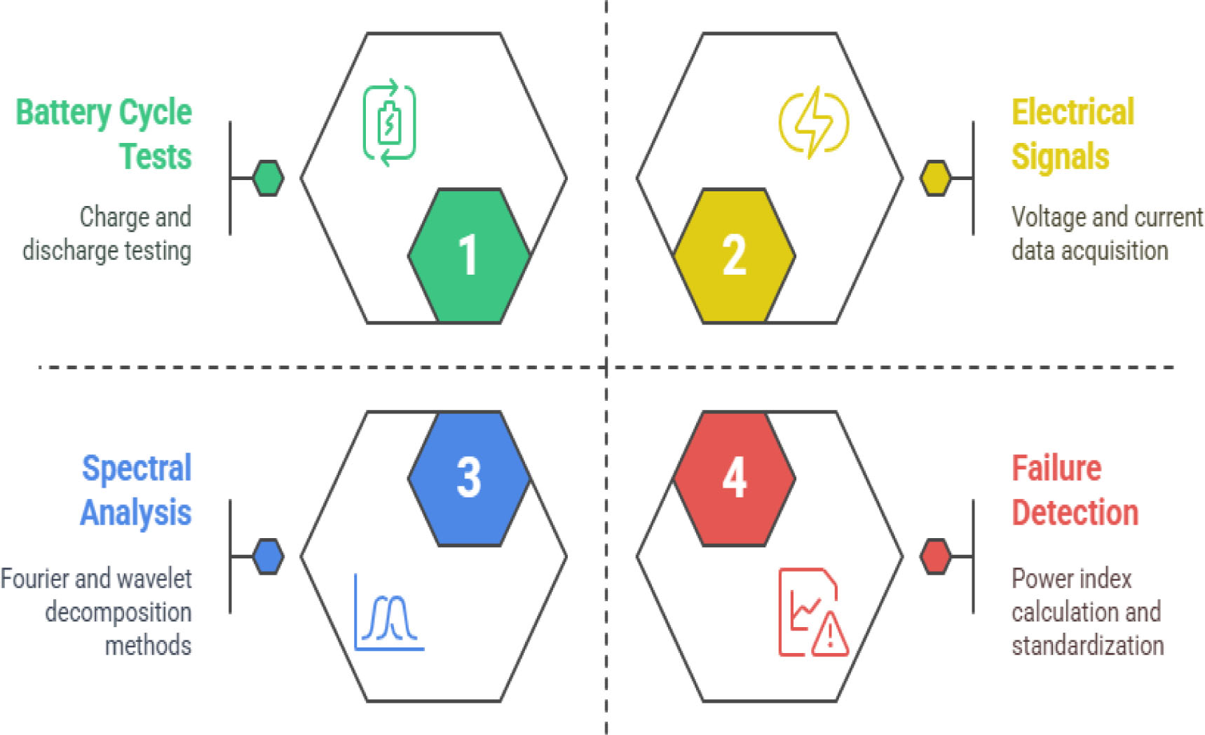 Figure 1 presents the workflow, which consists of four main phases: (i) data acquisition from controlled cycling experiments, (ii) signal preprocessing and noise filtering, (iii) spectral decomposition via Fourier and wavelet transforms, and (iv) fault detection based on characteristic frequency anomalies. To ensure robust feature extraction, the Morlet wavelet is employed, offering high temporal and frequency resolution ‒ essential for identifying early-stage battery degradation. Its proven effectiveness in analysing transient and oscillatory behaviour in non-stationary signals makes it particularly suitable for this application. This wavelet, composed of a complex sinusoid modulated by a Gaussian envelope, offers an optimal balance between time and frequency resolution, making it suitable for identifying subtle variations in battery voltage and current profiles. Compared to other wavelet families such as Daubechies or Mexican Hat, the Morlet wavelet maintains better frequency localization while preserving acceptable time sensitivity, which is essential for isolating low-frequency degradation patterns and short-lived anomalies. Previous studies have demonstrated the reliability of discrete wavelet transform-based methods for feature extraction and fault detection in lithium-ion batteries [25]. Additionally, novel wavelet-based approaches have proven effective in assessing cell-to-cell consistency through experimental voltage signal analysis [26].