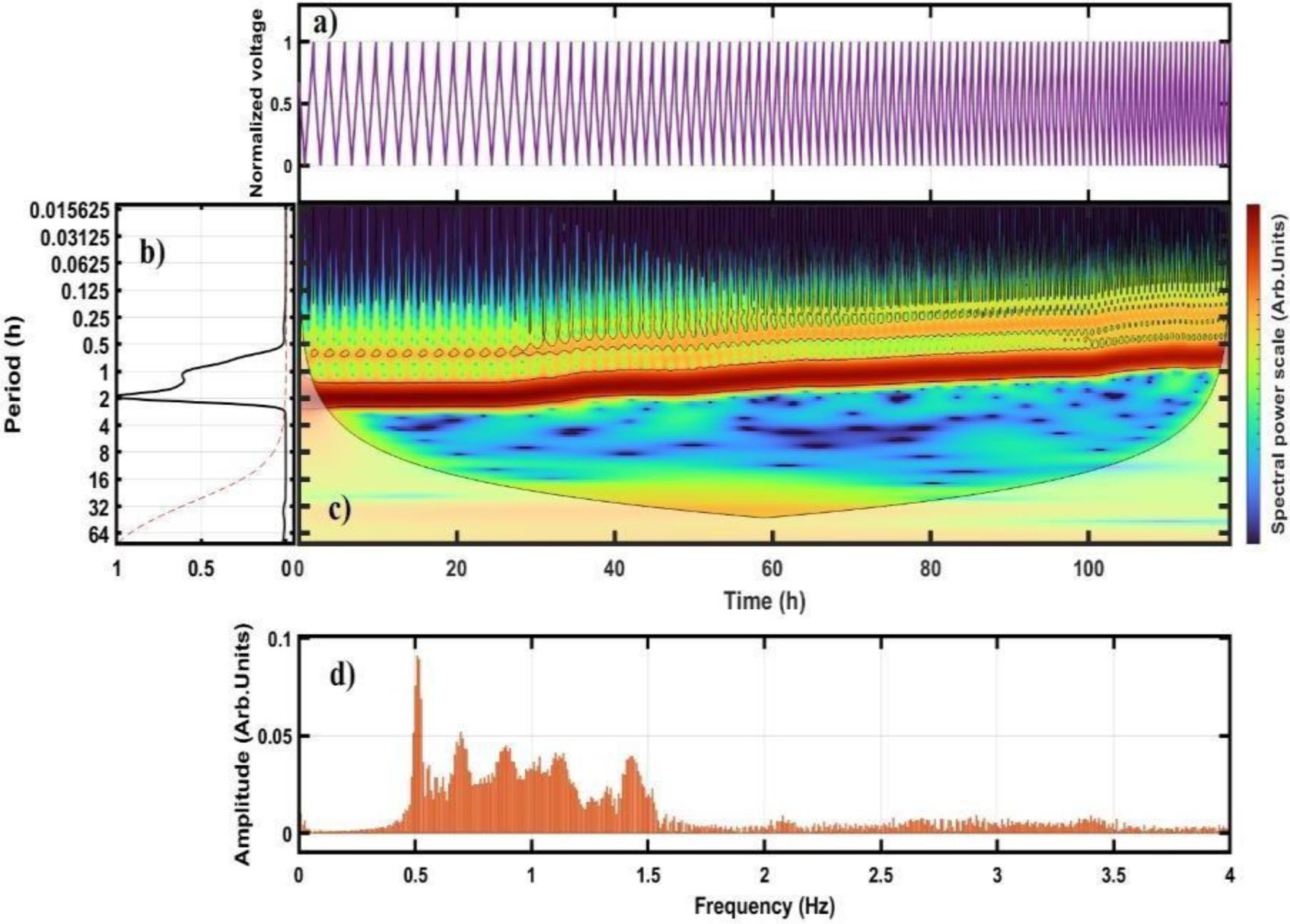 For this study, the Morlet wavelet was selected as the mother wavelet due to its effectiveness in capturing localized spectral power variations across different periodic scales. This choice enabled an in-depth examination of power fluctuations within the non-stationary time series of battery voltage, which contains multiple cyclic patterns [28]. The Morlet wavelet provides high resolution across frequency scales and being a complex wavelet, facilitates signal filtering into specific bandwidths [29]. The colour scale on the right side of Figure 2b, Figure 3b and Figure 4b represents spectral power distribution, where deep red indicates the highest power intensity and blue the lowest.