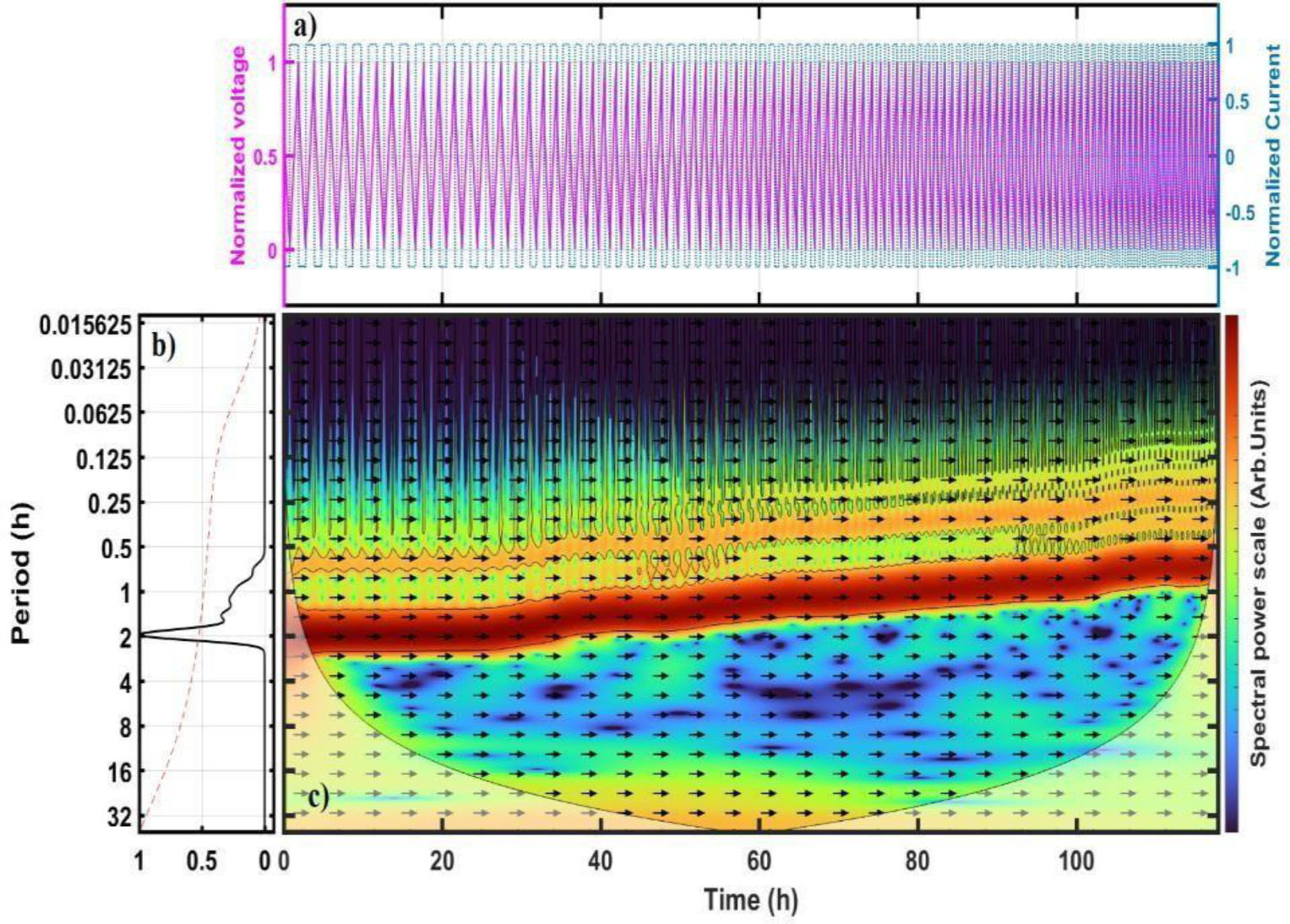 This analysis demonstrates that the two signals exhibit phase coherence over the studied time and frequency ranges. Furthermore, Figure 3b of the global wavelet spectrum reveals additional periodicities at frequencies lower than the primary one. Complementary findings are available in the supplementary material, where Figure S3c and Figure S4c illustrate the XWT spectral power for the SXC-2 and SXC-3 cells, both of which remained free from critical failure throughout the evaluation.