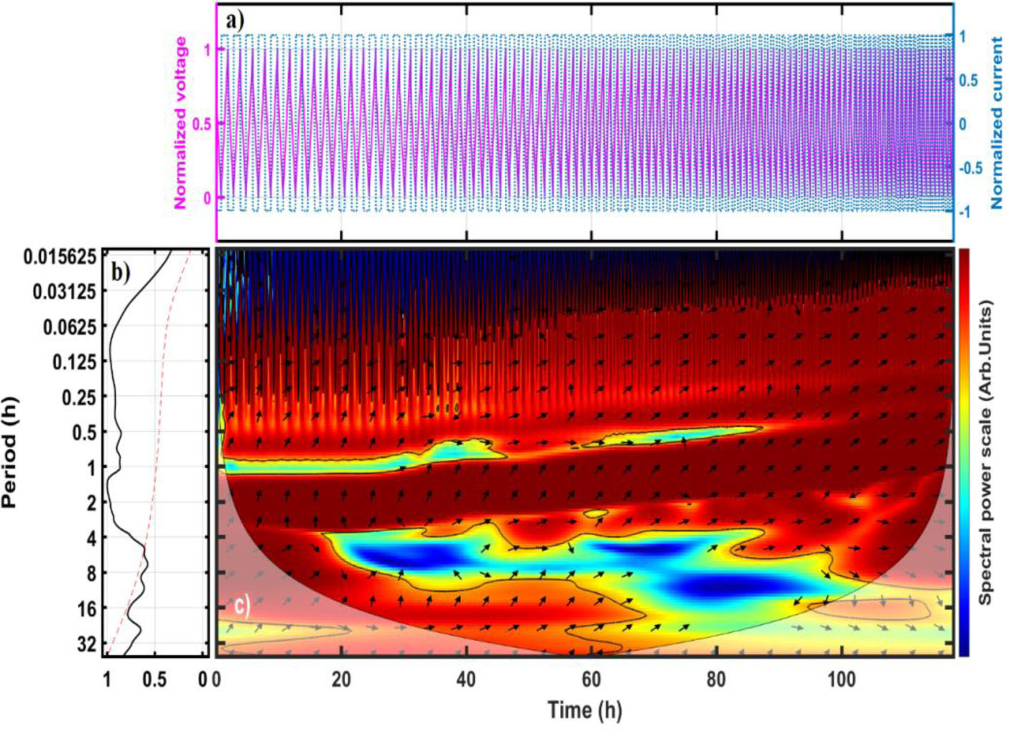 In this context, ⊛ represents the Hadamard product, while (*) denotes the complex conjugation operation. The symbols Wx and Wy correspond to the wavelet transforms of two time series, x and y, which represent the normalised voltage and current intensity measurements obtained from the SXC-1 battery cycling test, as illustrated in Figure 1a. Additionally, Figure 3c presents the cross-wavelet transform (XWT) results, depicting the interrelation between both time series through the wavelet power spectrum. The directional arrows in this figure indicate the phase relationship between voltage and current across the time–frequency domain. Specifically, arrows pointing directly to the right (→0°) or left (←180°) indicate linear synchronisation, implying an in-phase or anti-phase association between the two variables at a given frequency. Deviations from these alignments suggest a more complex, nonlinear synchronisation pattern [32].
