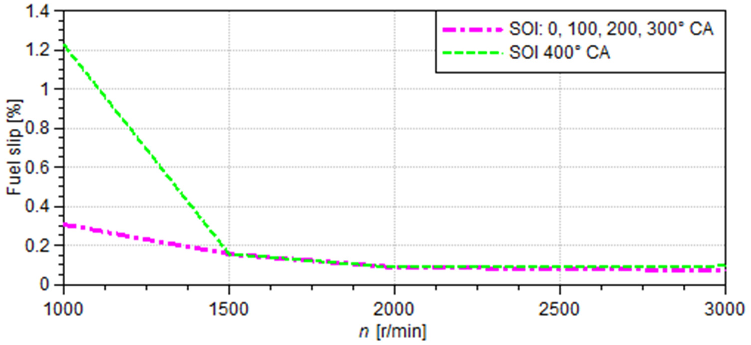 The results show that cases with SOI = 0, 100 and 200° CA have very similar results and that the fuel slip in these cases is the lowest. The cases with SOI = 300 and 400° CA give even worse results than the case with continuous injection. The difference between different injection timings is only observed at 1,000 r/min points, while at higher engine speeds the differences can be neglected.