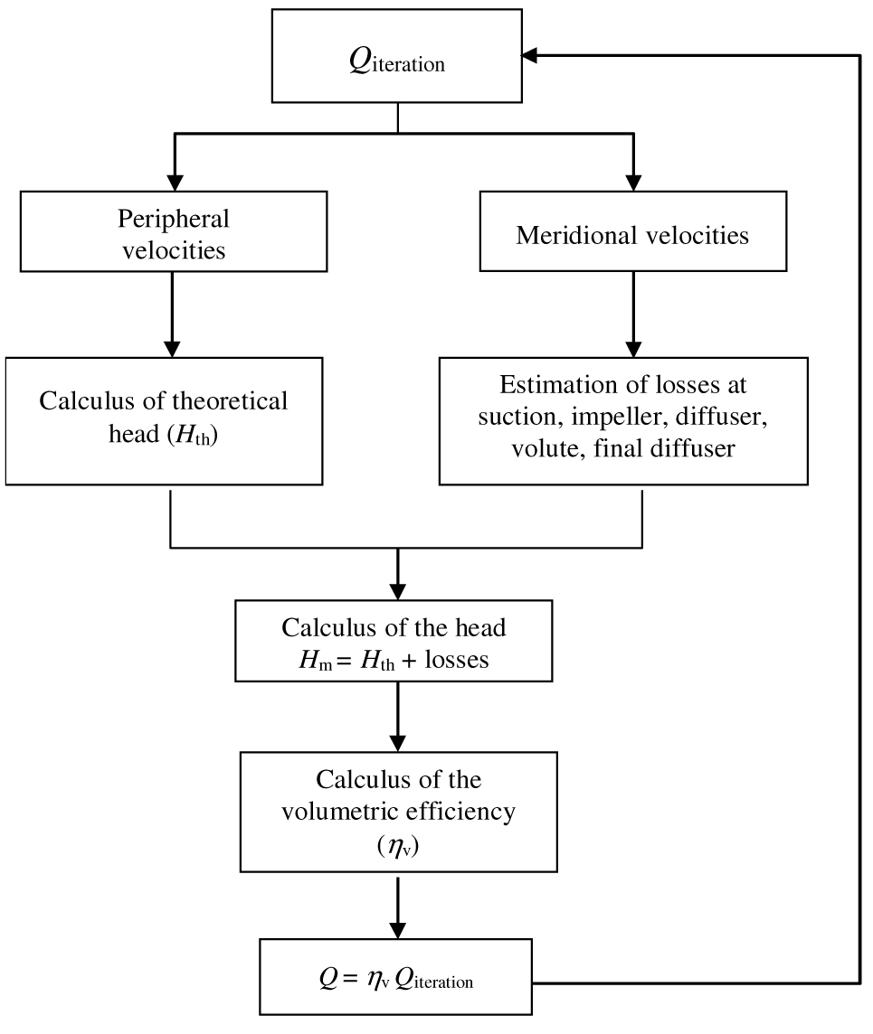 The flow chart illustrated in Figure 7 summarizes the whole process that begins by setting the initial value (Qiteration) of the capacity. This value has to take into account the leakages through clearances and then the volumetric efficiency (ηv). For this reason, the procedure is iterative.