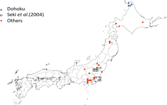 Another application of the method is to groundwater data [21], and the database in Japan [22] for analysis of the in-situ conditions governing redox reactions. Approximately 70 points are selected to satisfy the PHREEQC input data conditions. Figure 7 illustrates the locations of the wells including the Dohoku area (black solid circle), Eastern Kanto district with Seki et al. data [21] (blue solid circle) and other areas (red solid circle). The Dohoku area includes the JAEA boreholes, petroleum wells and hot spring wells. Seki et al. data all comes from hot spring wells. The other area includes natural gas wells, coal mine boreholes, observation wells and hot spring wells. According to the intervals of the wells at which the groundwater was pumped up, the geology is quite different as follows: mudstone, shale, siltstone, sandstone, green tuff, tuffaceous breccia, welded tuff, granite, granodiorite, rhyolite and andesite. Redox reactions involve elements contained in the rocks and the groundwater, which could vary in valence states depending on the redox condition. At first, the elements of Fe, Mn, S and C are selected as redox relevant ones in the rocks, because they exist in greater content in the various rocks [23]. The relative contents of the elements are summarised in Table 4.