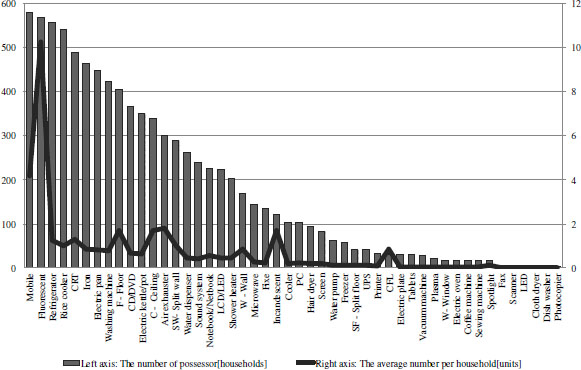 On the other hand, the line chart with right axis shows the number obtained from the total number of ownership respondents of each appliance divided by the number of respondents from 577 households. For example, the average number of units of fluorescent lamps in each household is 10 units. In contrast, the average number of units of mobile phones is 4.