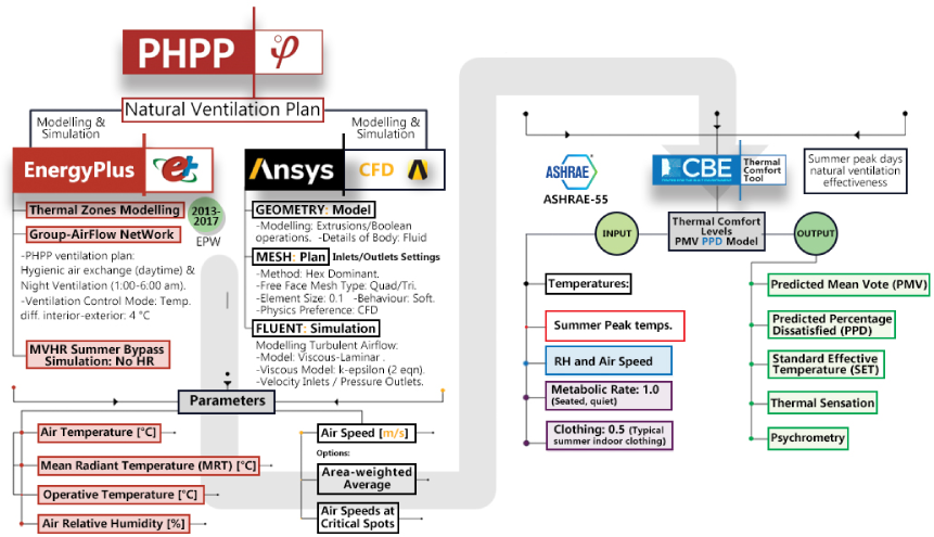 The previous inputs represent a measure of an average occupant’s thermal sensation. The diagram in Figure 7 explains the workflow, presenting some basic settings for the Passive House modelling in EnergyPlus and ANSYS.