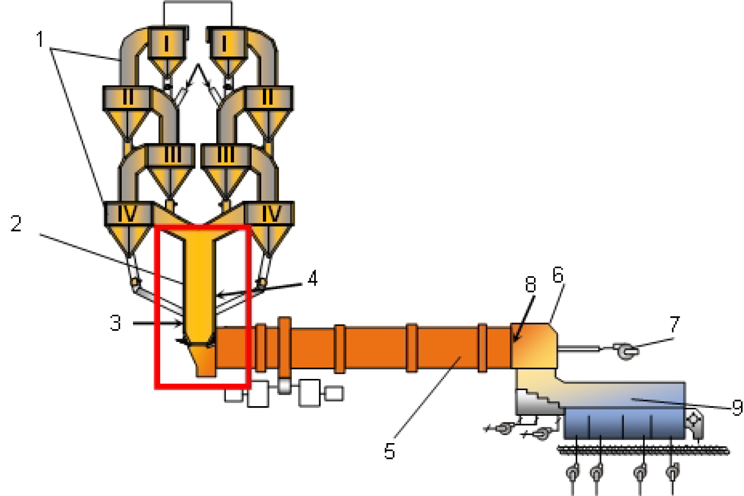 Scheme of cement rotary kiln: 1 – preheater tower, 2 – AT preheater (AT-type precalciner), 3 – tertiary air, 4 – inlet of SRF, 5 – cement kiln, 6 – kiln head, 7 – primary air, 8 – secondary air, 9 – cooler