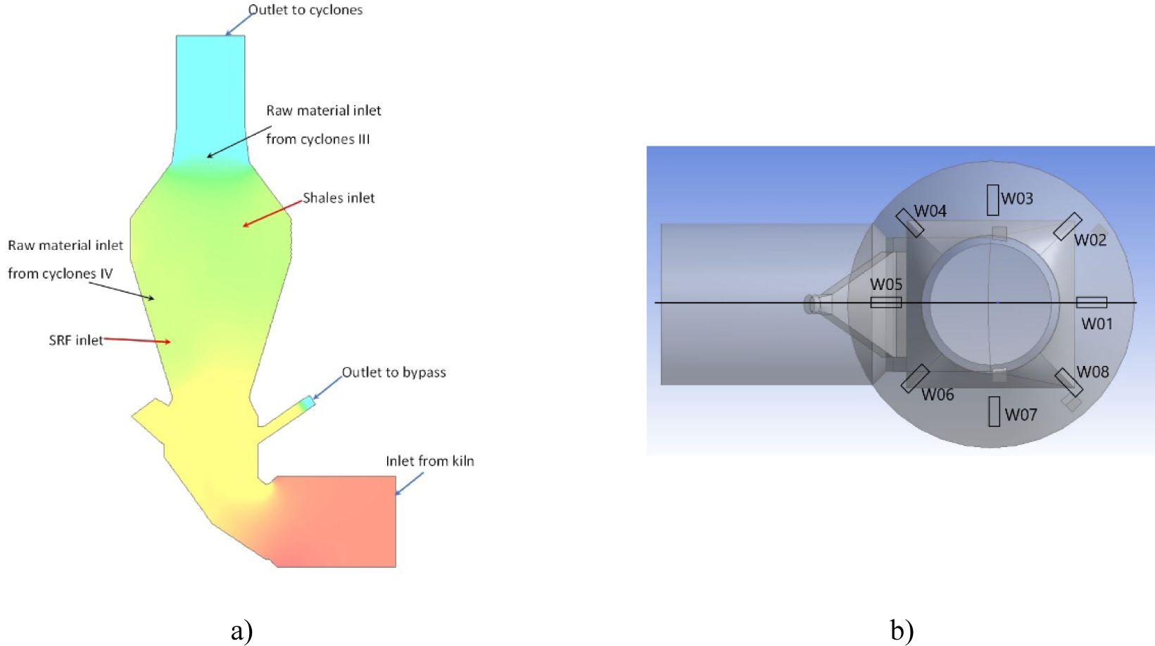 The conducted research focused on determining the location of SRF inlet to the AT-type precalcinator and the methodology involved precisely identifying the inlet location, considering one level, which resulted from previously conducted preliminary research. Eight inlet variants (W01-W08) at this level were examined, differing in position, with each subsequent inlet located at an angular distance of 45 degrees. The localization of the variants is presented in Figure 2b.