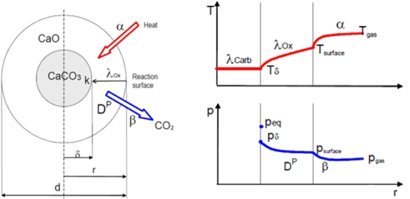 a) temperature and pressure distributions in the volume of the particle, b) calcination mechanism