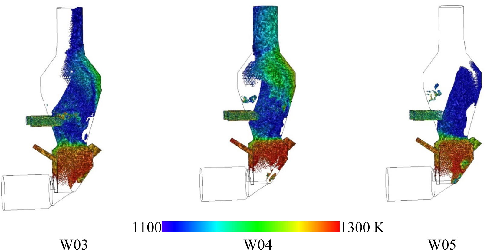 In the developed mathematical model, it is possible to precisely determine the temperature in each cell, enabling the identification of regions where the calcination process occurs more rapidly. This means that areas with higher temperatures will facilitate a more dynamic progression of this process. Figure 4 depict these regions where the temperature ranges from 1100 to 1300 K, allowing for the identification of locations where calcination may occur most efficiently.