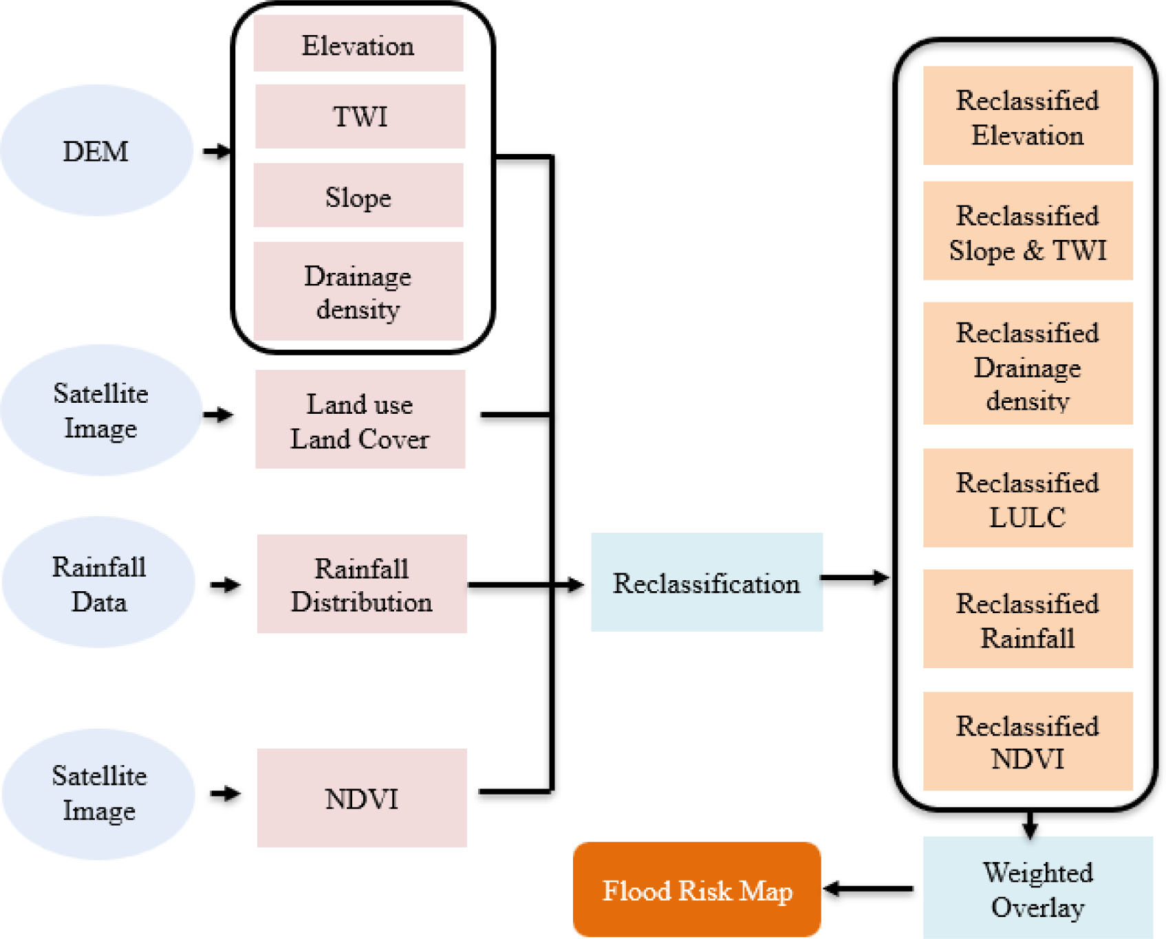 Figure 1 outlines the application of MCDA analysis for flood risk mapping. It begins by integrating various data sources, including the DEM, satellite images, rainfall data, and land use/land cover (LULC) information. Each input is processed to extract relevant factors like elevation, TWI, slope, drainage density, land use, rainfall, and NDVI. These factors undergo reclassification to standardise their values for analysis. Finally, a weighted overlay of the reclassified data generates a flood risk map, aiding in flood susceptibility assessment.
