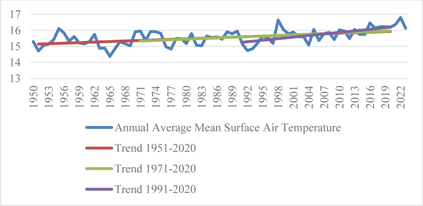 The rate of temperature increase has accelerated in recent decades, as shown in Figure 3. While annual temperature fluctuations are evident, the overall pattern suggests a long-term warming trend. The steeper slopes of the trend lines for the more recent periods further confirm that temperature rise has intensified over time. Such a rise in temperature can significantly impact flood risks. Warmer air holds more moisture, leading to heavier and more intense rainfall, which increases the likelihood of flooding.