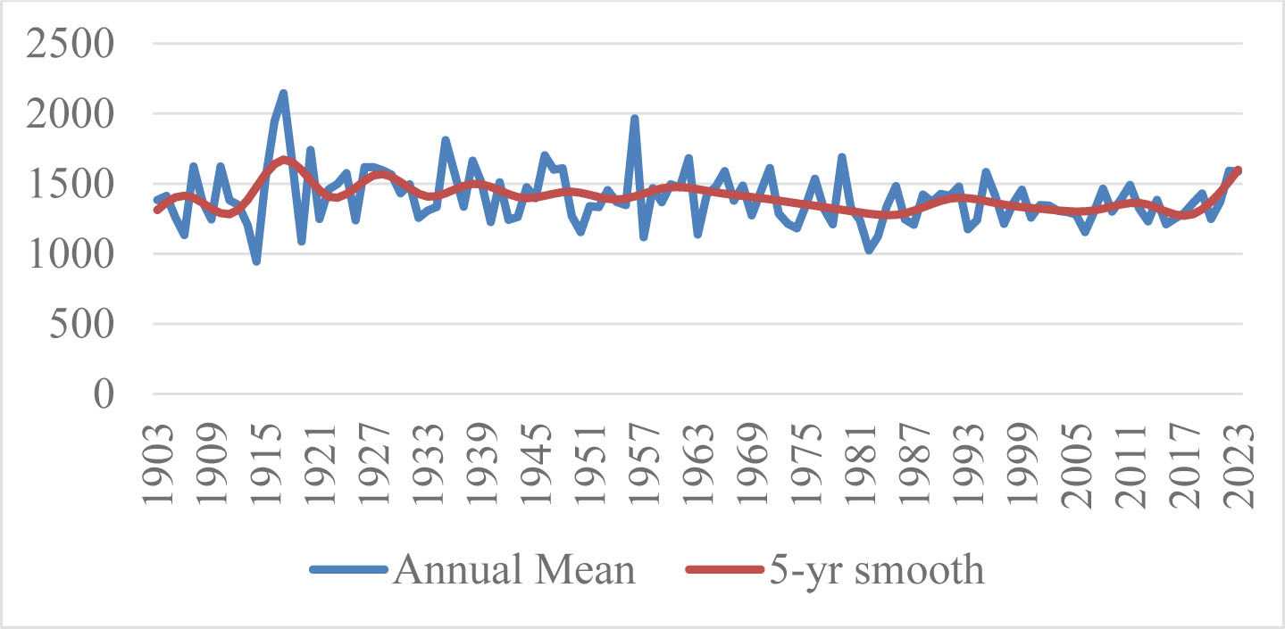 Figure 4 shows the annual precipitation of Auckland (1903–2023) graph, which indicates fluctuations in rainfall over the past century, with periods of both increasing and decreasing trends. While precipitation was highly variable in the early 20th century, the data suggest a gradual increase in recent decades, particularly after 2000. It could indicate a shift in rainfall patterns, which contributes to higher flood risks.