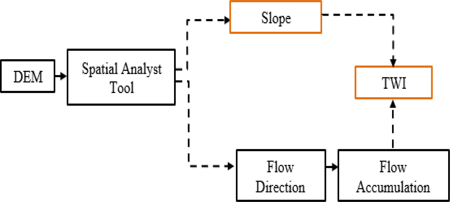 The susceptibility analysis is to identify key factors that ensure reliable and accurate results. Drawing on a comprehensive literature review, this study integrates widely recognised factors that influence flood susceptibility, including proximity to slope [32], aspect [33], elevation [34], and Topographic Wetness Index (TWI) [35] other critical variables include rainfall [36] drainage density [37], Normalised Difference Vegetation Index (NDVI) [38] and land use and land cover (LULC). Together, these factors form the basis for an effective and comprehensive susceptibility mapping framework.