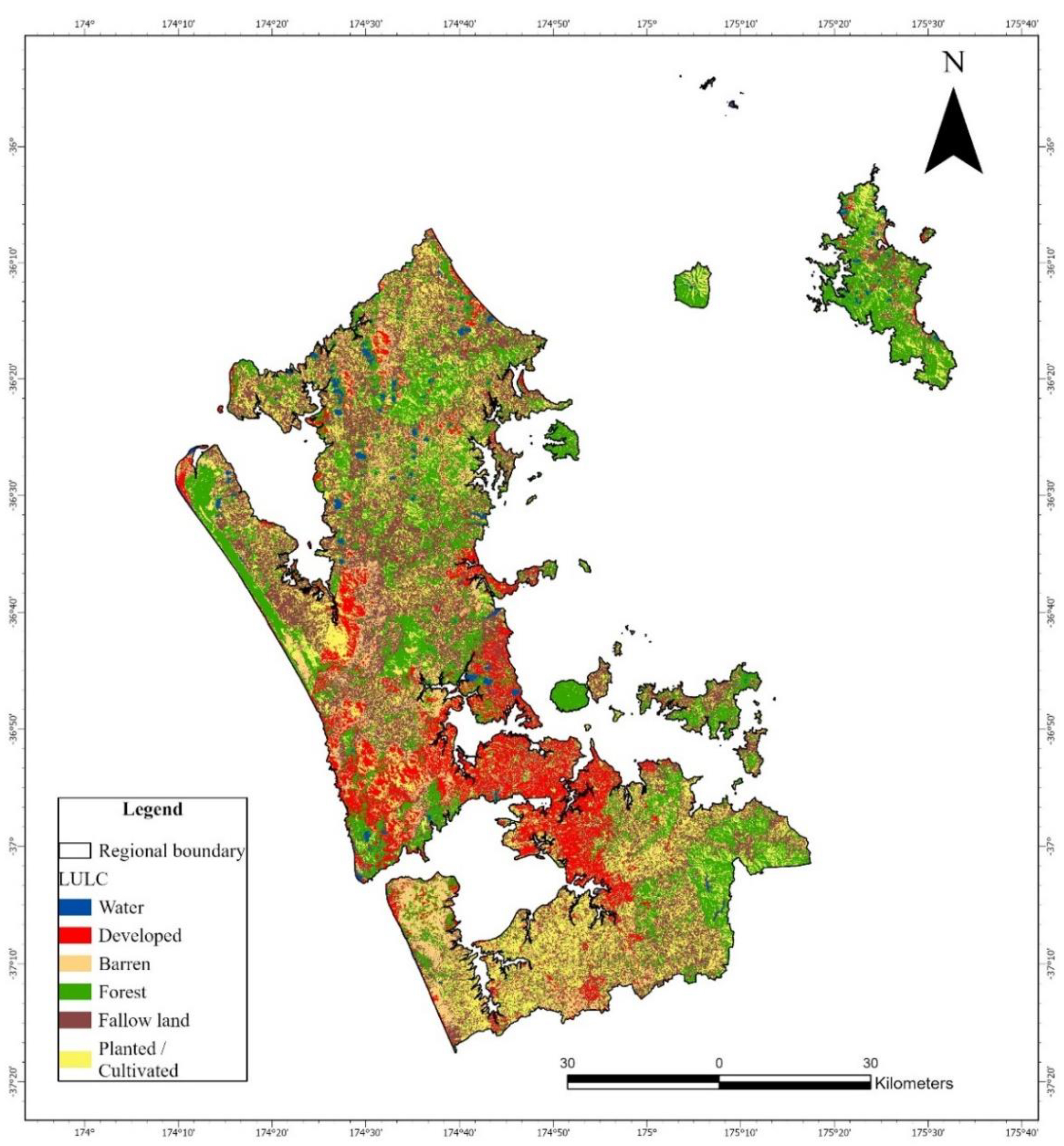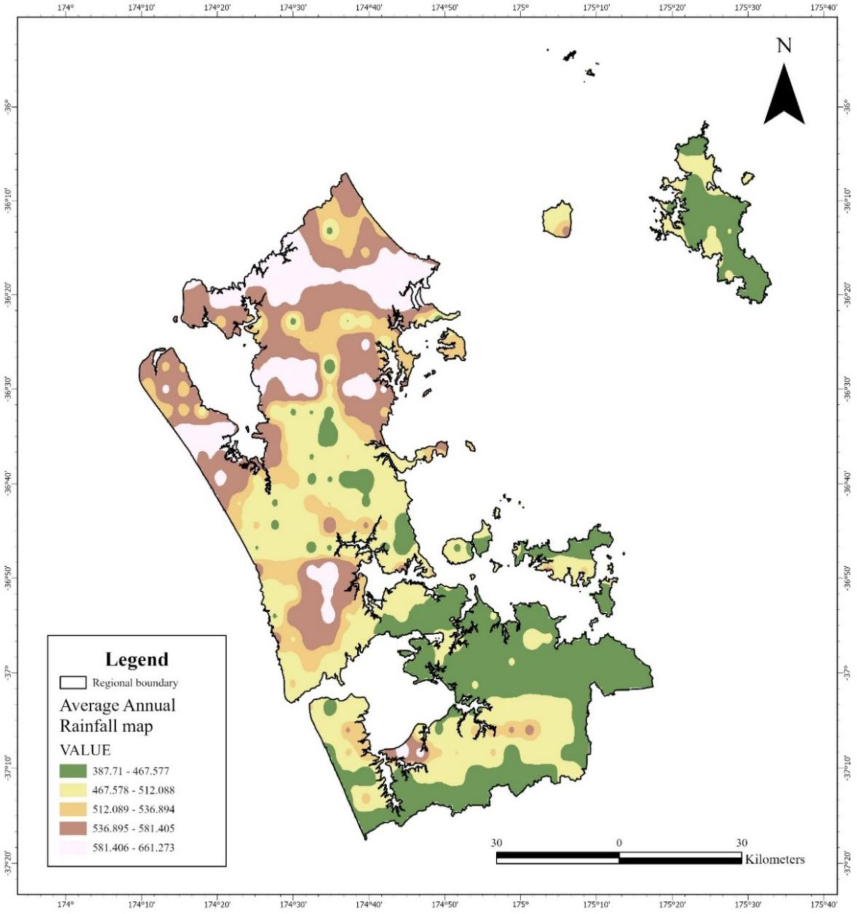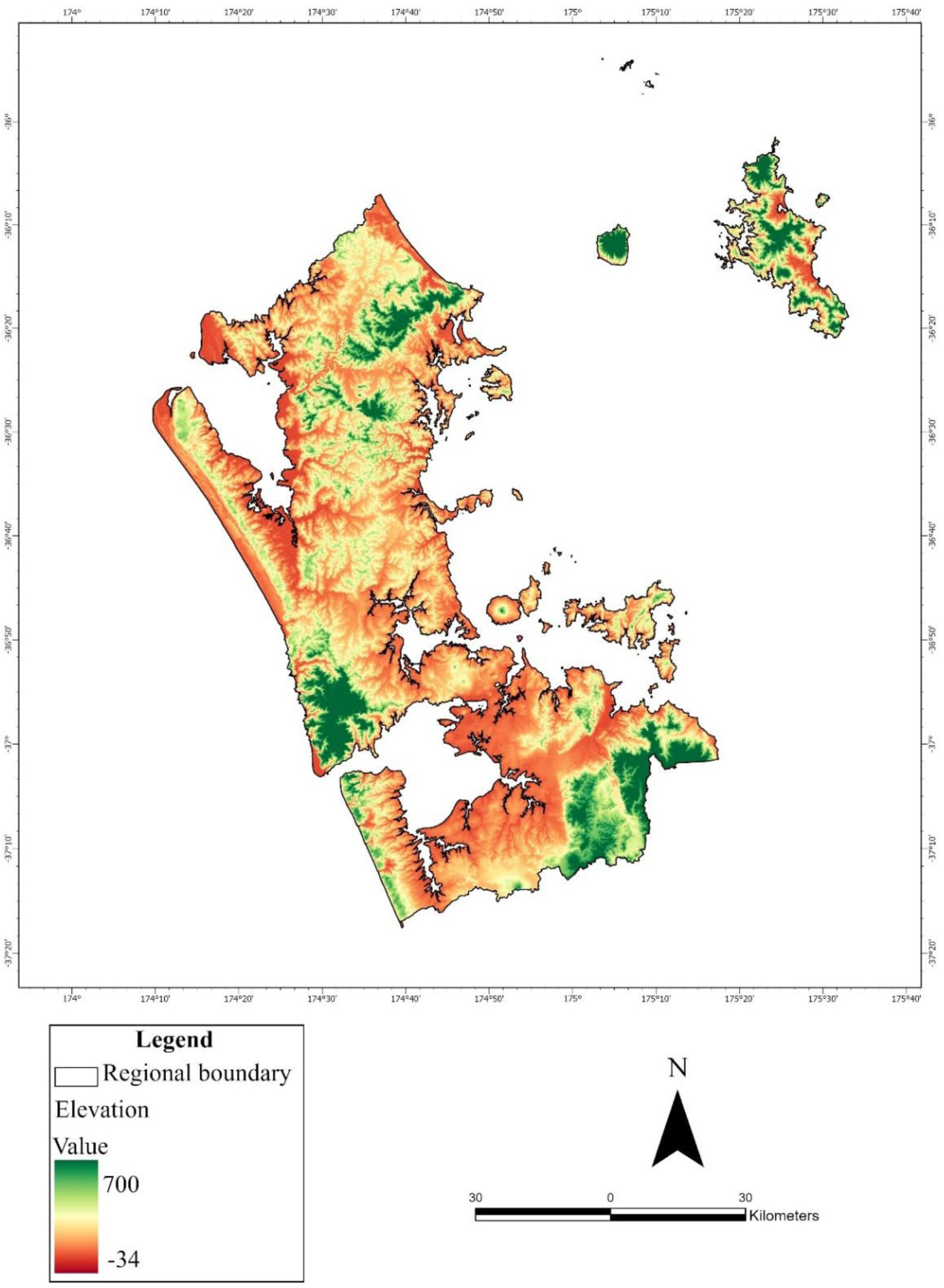 Auckland, which is the focus of this study, lies in the northern part of New Zealand's North Island, between latitudes 36°45'–37°10' south and longitudes 174°30'–175°10' east, covering approximately 1,086 km2. Mount Eden, at 196 meters, is the highest point in central Auckland, as illustrated in Figure 2. The Tasman Sea borders Auckland to the west, the Hauraki Gulf and Pacific Ocean to the east, the Waikato region to the south, and the Northland region to the north. The Tamaki River, in the east, connects through tributaries near urban Auckland. Auckland's geography features two principal harbours: Waitemata Harbour to the north and Manukau Harbour to the south, forming a distinctive isthmus. The Waitemata Harbour drainage basin is vital for water management. Urban areas consist of flat to rolling terrain, while surrounding regions are rugged with volcanic cones and ranges [41]. Around 80% of the region is urbanised or semi-urbanised, shaped by its unique volcanic and coastal landscapes [42].