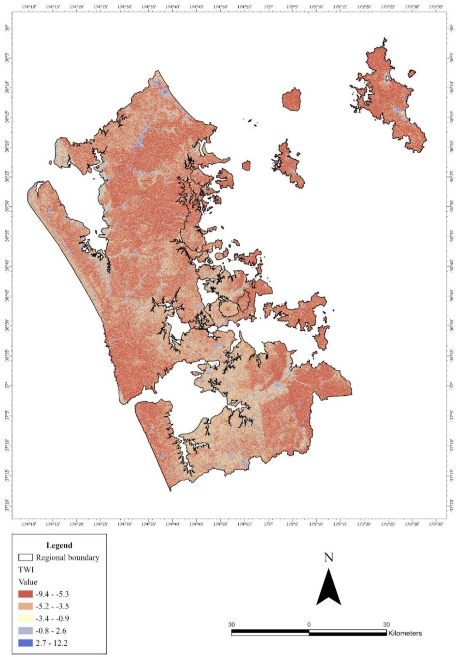The map from Figure 14 highlights that certain northern and northeastern parts of the region, along with some offshore islands, have higher flood risk, whereas central and southern areas of Auckland generally exhibit lower flood susceptibility. The south and central parts of Auckland show a predominance of low to very low flood susceptibility, marked in green on the map. These areas are likely covered with more vegetation and forested land, which helps absorb rainfall and reduces the risk of flooding.