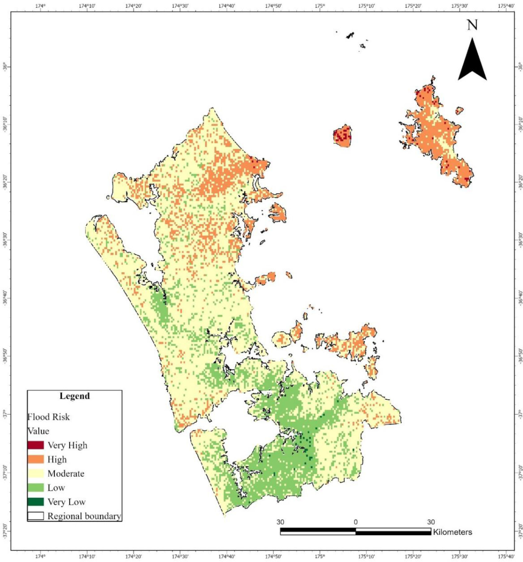 These findings suggest that the majority of Auckland is currently exposed to a moderate level of flood risk. However, the potential intensification of urban development and deforestation activities poses a significant threat to this balance. Without the implementation of robust flood management and land-use planning strategies, there is a heightened likelihood that areas presently considered moderate or low risk could transition into higher risk categories over time. Therefore, proactive measures are critical to sustaining current risk levels and enhancing the city's resilience to future flood events.