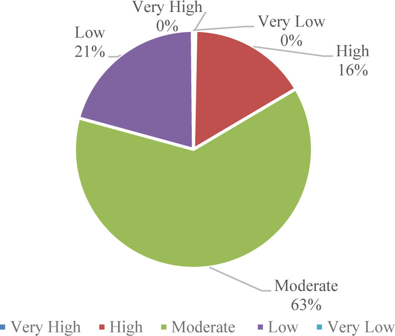 Figure 15 presents a pie chart illustrating the spatial distribution of flood risk levels in Auckland, derived from the corresponding flood risk map. The results reveal that a substantial proportion of the area (63%) falls within the moderate risk category. Additionally, 21% of the area is classified as low risk, while 16% is designated as high risk. Notably, the analysis indicates that no regions fall under the very high or very low risk classifications.