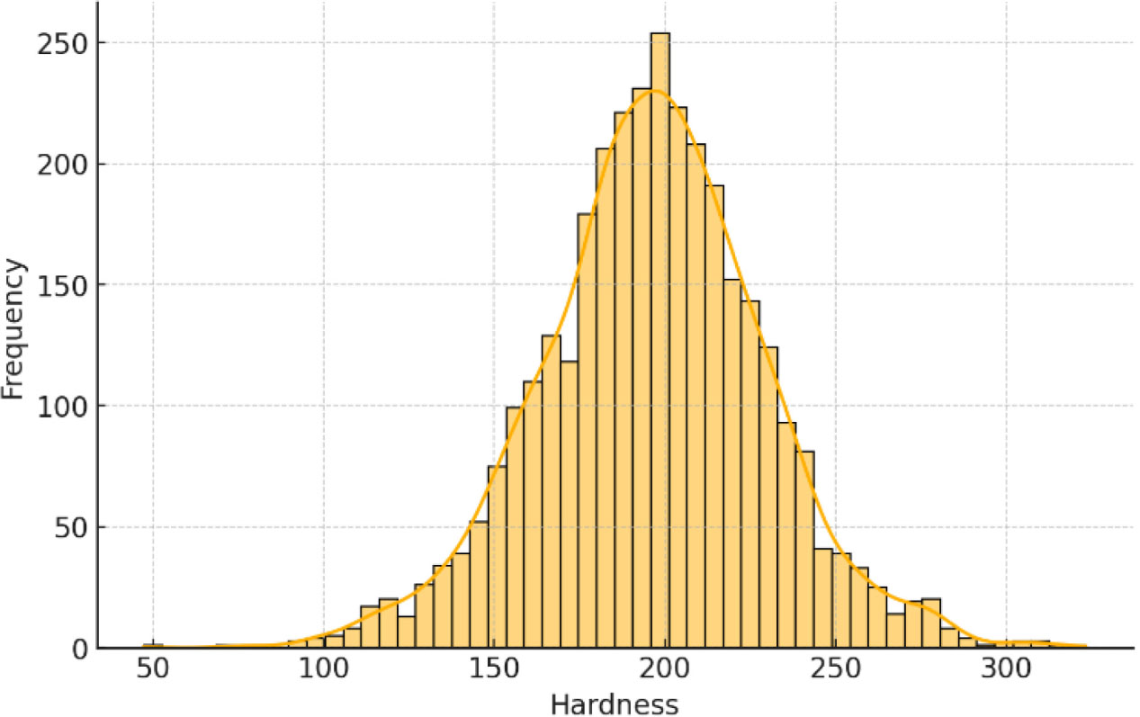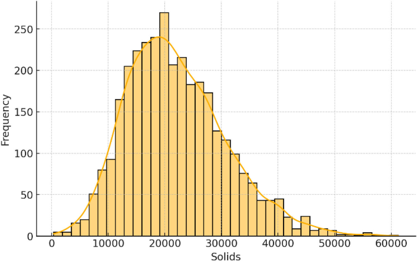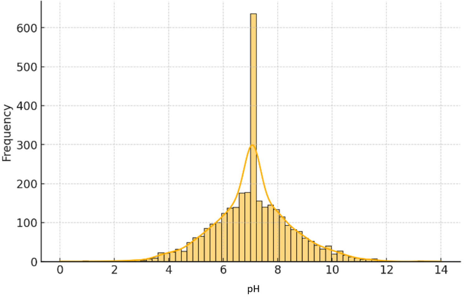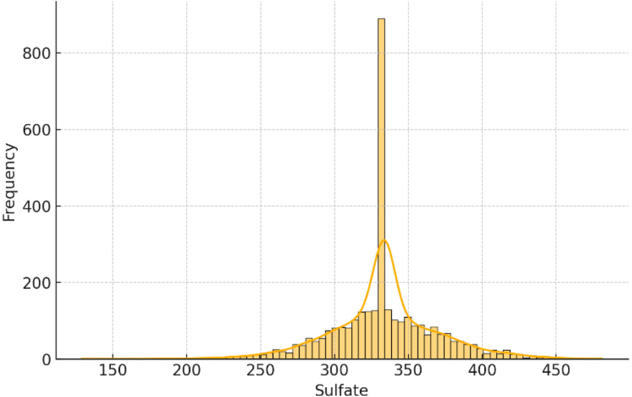 The next step was to carry out exploratory data analysis (EDA). It includes examining histogram distribution for each feature, handling missing values (either by filling or removing), generating correlation analysis (heatmap), checking class balance for potability, and generating statistical summaries by calculating the mean, median, standard deviation, and minimum and maximum values. The results of this analysis were then presented visually. Figure 1 to Figure 4 show the distributions of pH, hardness, solids, and sulfate. From those figures, it can be seen that features are not perfectly normal, but many are skewed (e.g., solids, sulfate).