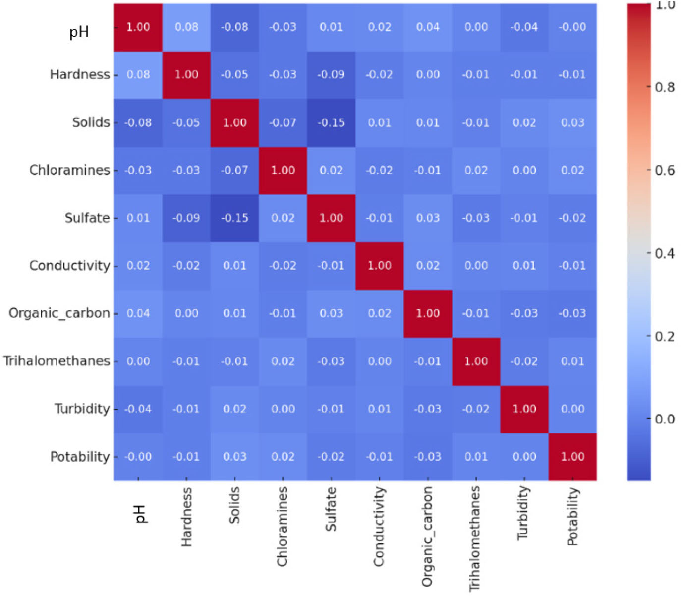 Figure 5 shows the correlation heatmap of the nine features besides the potability. It can be seen that some positive correlations were observed (e.g., solids and conductivity). Most other features are weakly correlated with each other and with potability. In general, the weak correlation between features means the features are independent, and each feature has its own influence on the result of potability.