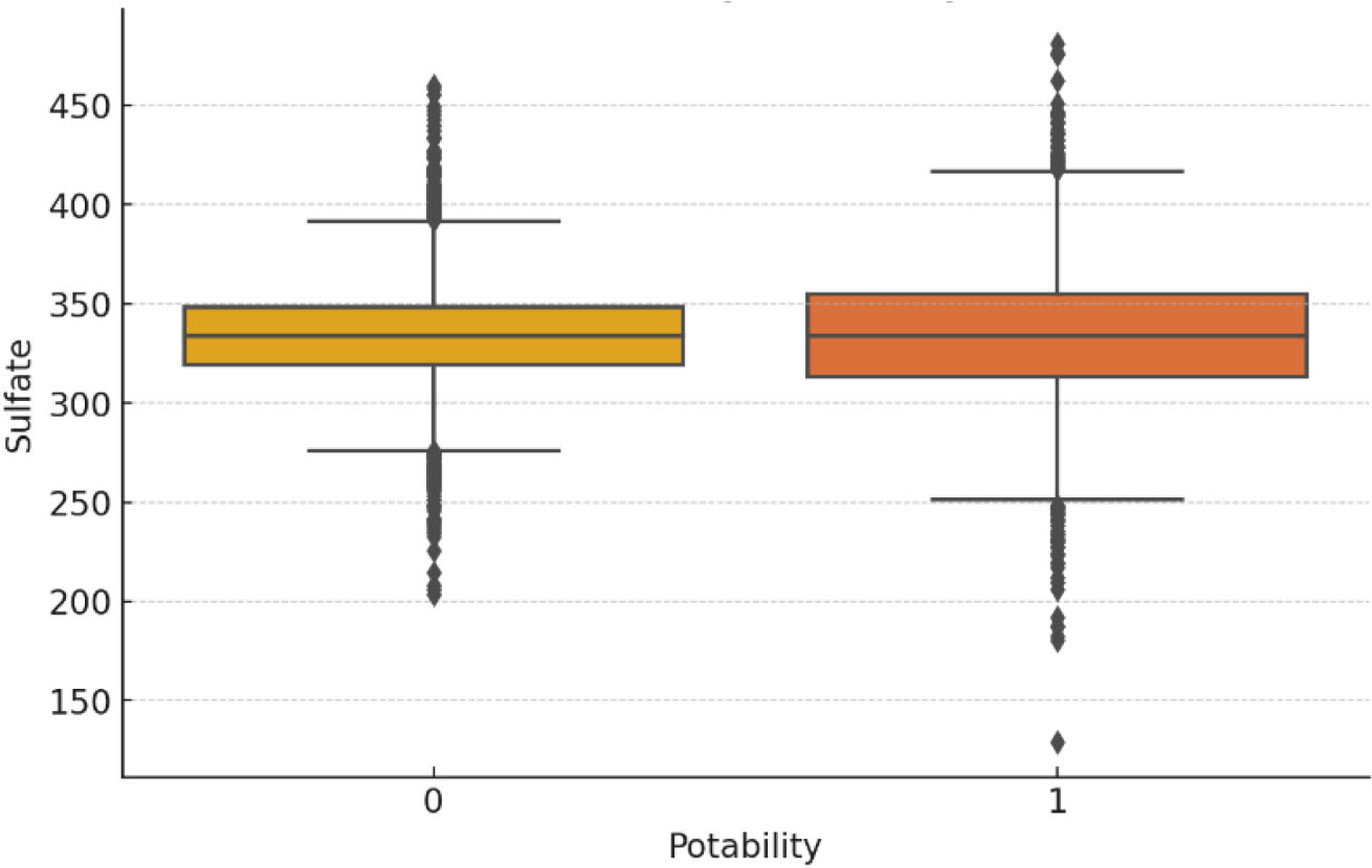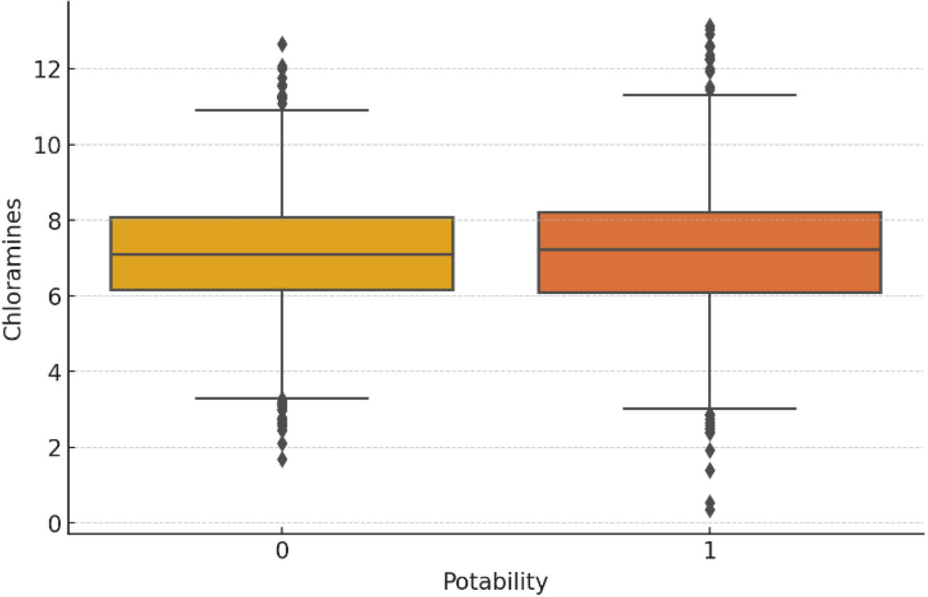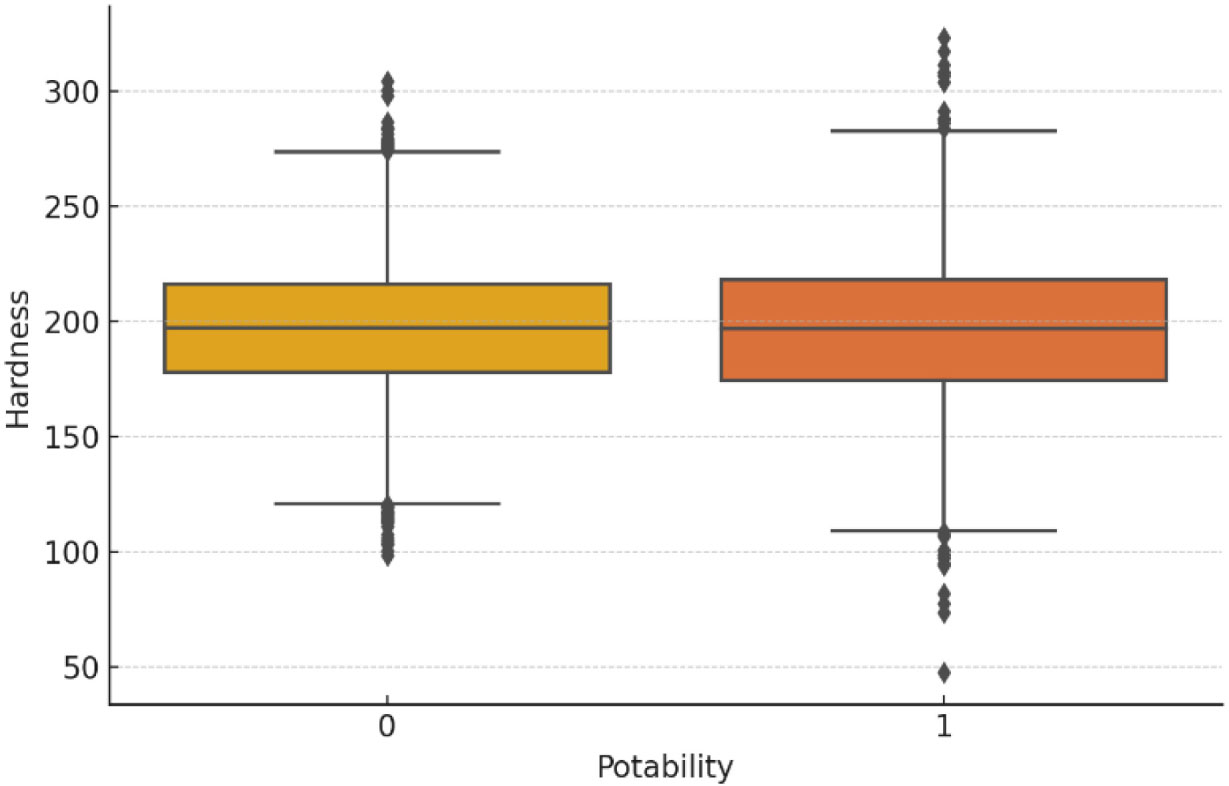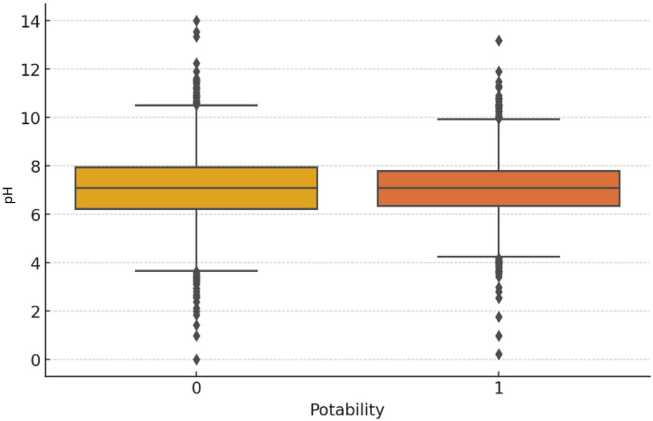The dataset has class imbalance, with 1,998 records labelled as “Not Potable” and 1,278 records labelled “Potable”. This imbalance is an important consideration for designing machine learning algorithms later, as it may necessitate applying class-balancing techniques. To get a better idea about the features and their effect on potability, boxplots were generated to detect outliers, as shown in Figure 6 to Figure 9.