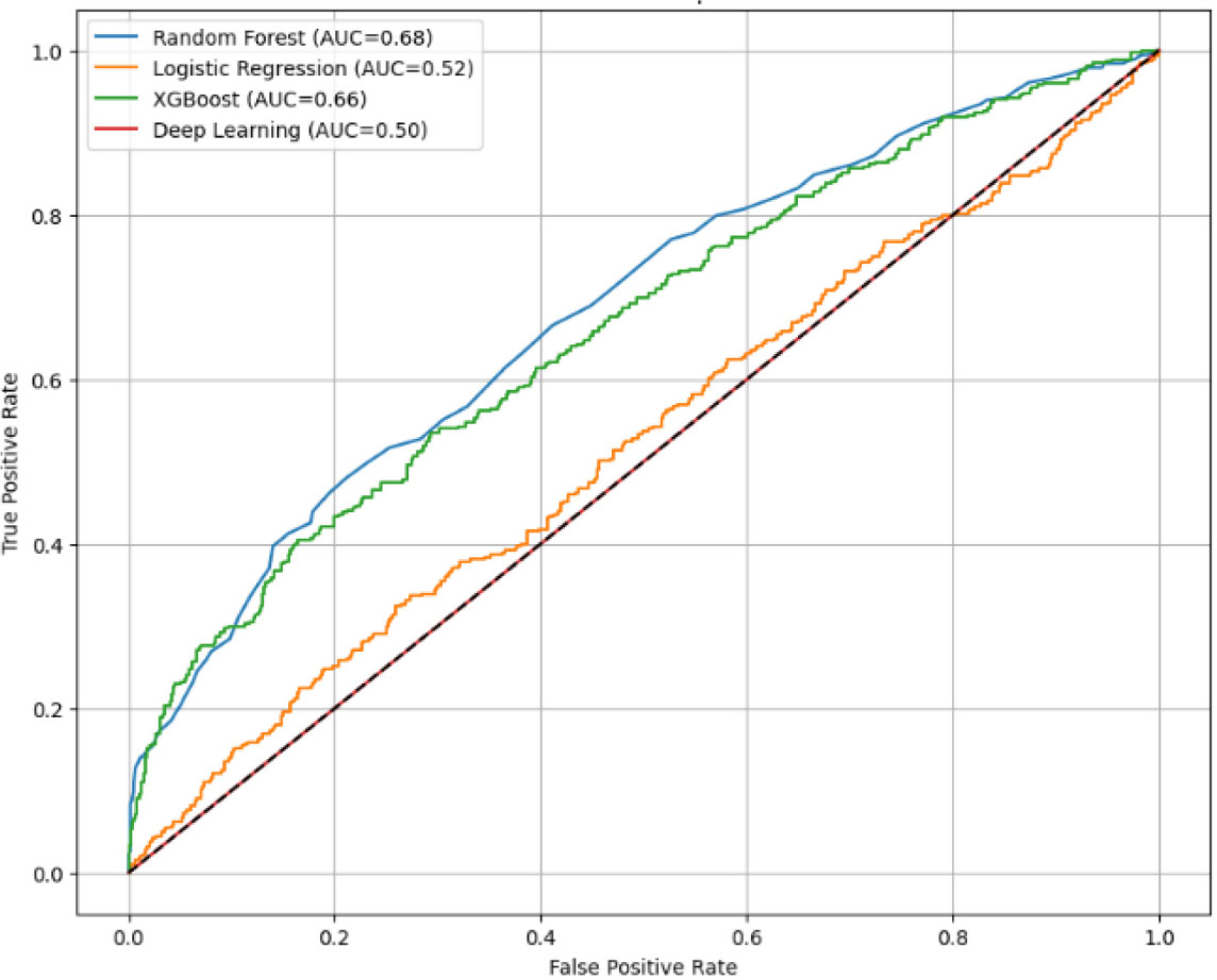 To show the impact of the improvement after class balancing, hyperparameter tuning, and feature engineering, one can compare the results shown in Table 3 and Table 5. As can be seen from this comparison, all four models improved their performance significantly, with Random Forest and XGBoost improving the most. For example, Random Forest F1-score improved from 0.47 to 0.85, and XGBoost from 0.49 to 0.86, while Logistic Regression and Deep Learning MLP also saw a significant improvement from near-random performance to competitive performance.