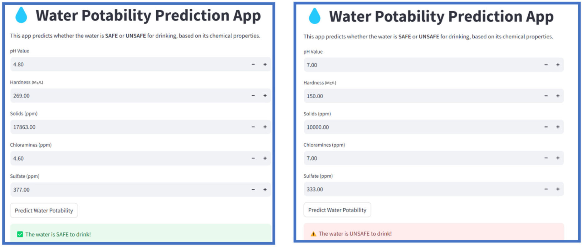 Lastly, an application was created using Python joblib and Streamlit. The application provides the user with a prediction of whether the water is drinking “SAFE” or “UNSAFE” after entering the values of the required chemical properties or the feature values on the GUI. The XGBoost model was saved (exported) using the joblib library. Then, the application was built using Streamlit, which is a Python-based framework for rapid app deployment. Figure 16 shows two examples of executing the application. The app can be implemented on mobile devices, PCs, or other platforms, allowing easy visual interaction with users interested in predicting water potability.