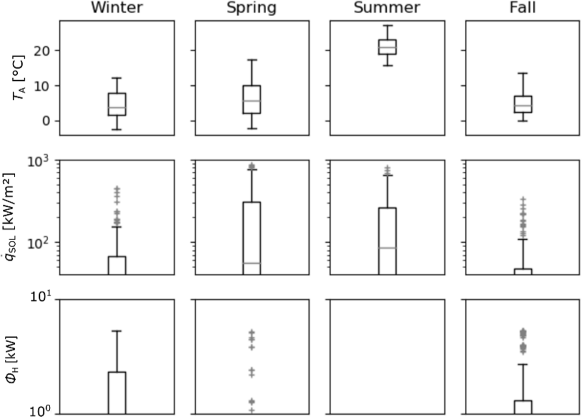 To characterize the operating condition of the building for different validation periods, the input data distribution is analyzed and shown in Figure 6. As the heat pump is only used for heating and not for cooling, the heat flow into the thermal zone (ϕH) is zero during the summer period. It can be visualized, that the operating conditions of the winter and the fall period are most similar with respect to mean ambient temperature, solar irradiance, and their variance. This is reflected in the model validation process, as described below.