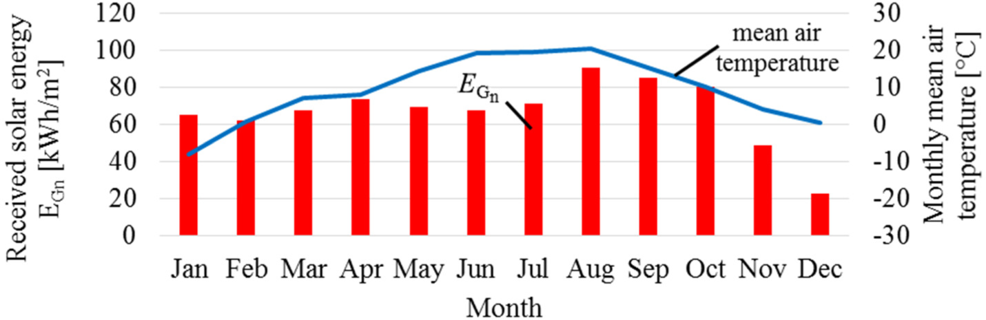 Monthly received solar energy calculated based on onsite measured solar irradiance and monthly mean outdoor air temperature