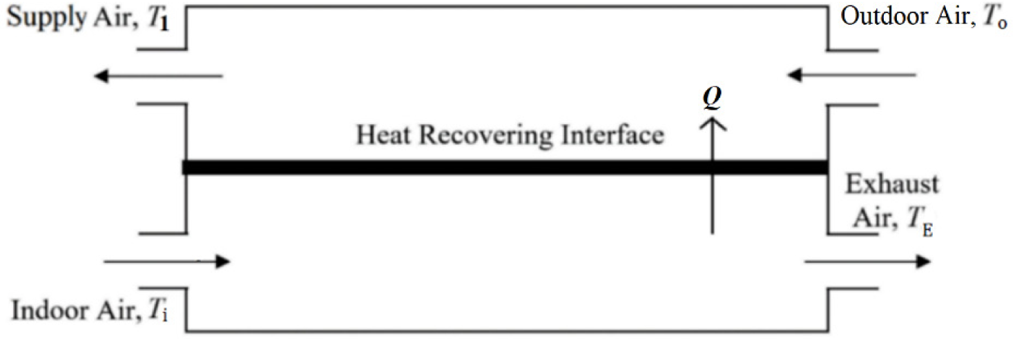 Figure 1, which is a reproduction from the ASHRAE Handbook-HVAC Systems and Equipment, shows the basic model for a fixed-plate, A-A type HRV unit. In this figure, the stand-alone HRV model considered as isolated from its surroundings and the additional/oversized fans and the power grid [29]. Even if such factors are included, they are limited to the quantity of energy recovered and spent by neglecting their different qualities. The unit exergy of thermal power gained or extracted (in cooling), εH is substantially lower than the unit exergy of electric power, εE which is virtually 1 W/W.