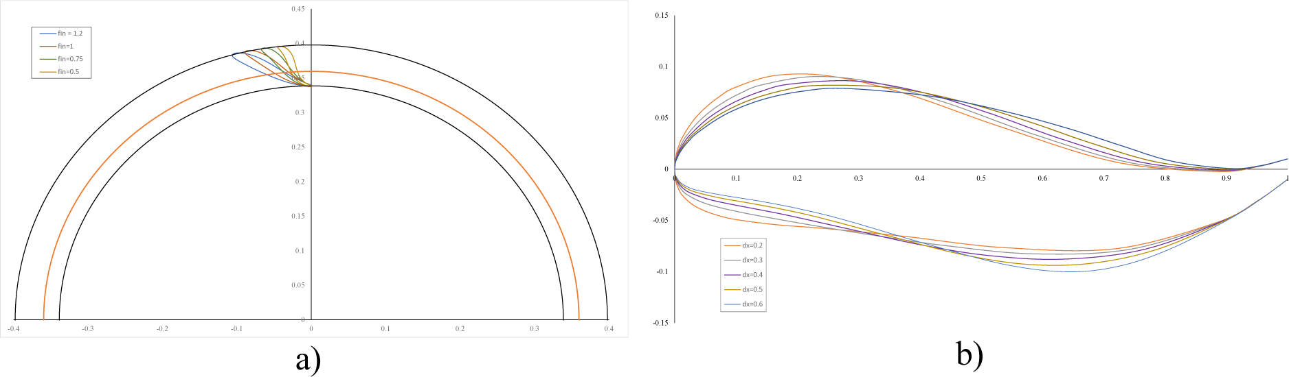 By applying the parameters from Table 2 in the tool and varying the normalized chord line angular position φn and the maximal thickness location dx, different guide vanes designs were generated. The first group of designs considers constant location of maximal thickness at 33% of the chord length, while changing the normalized angular position for 0.5; 0.75; 1 and 1.2 whereas the second group of designs considers constant angular chord line position of 1 and variable location of maximal thickness at 20%, 30%, 40%, 50% and 60% of the chord length (Table 3).
