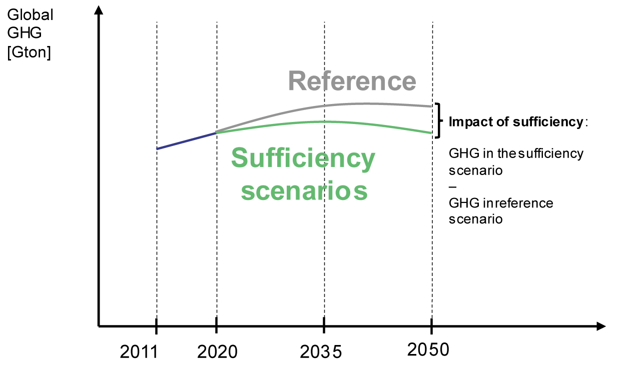 Representation of Reference and Sufficiency Scenarios in FULFILL. The example is here applied to the indicator “GHG emissions”