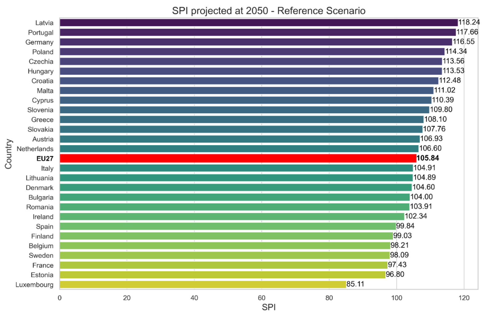 As shown in Figure 7, by 2050, the Sufficiency Scenario’s SPI would improve for all EU countries.