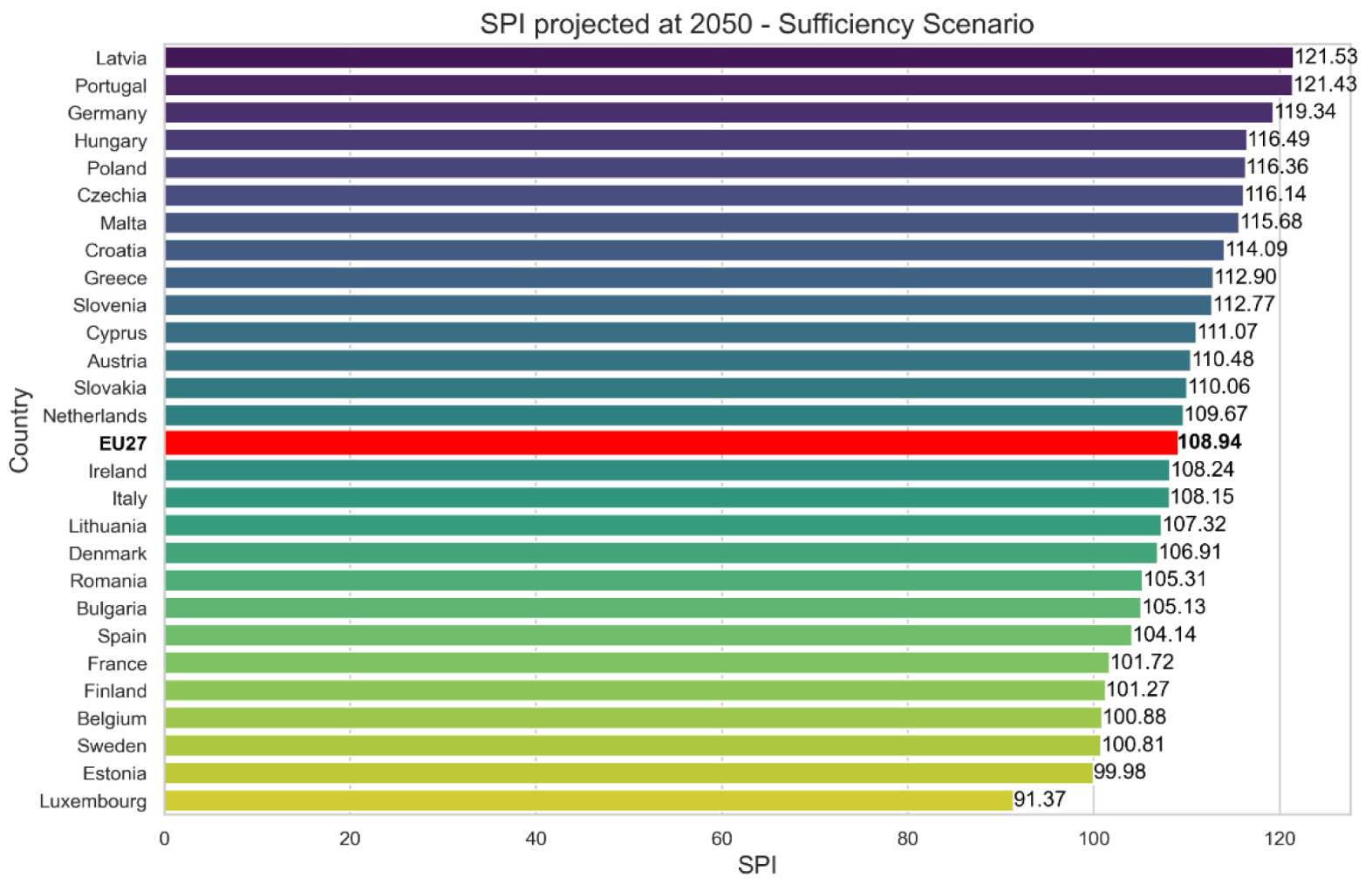 Under the Sufficiency Scenario, Latvia maintains the highest performance with a SPI of 121.53, showing a notable increase from the Reference Scenario (118.24). This would indicate Latvia's valuable role to achieve sufficiency goals by 2050. Moreover, Portugal and Germany would both maintain their position in the top 3 list of the ranking.