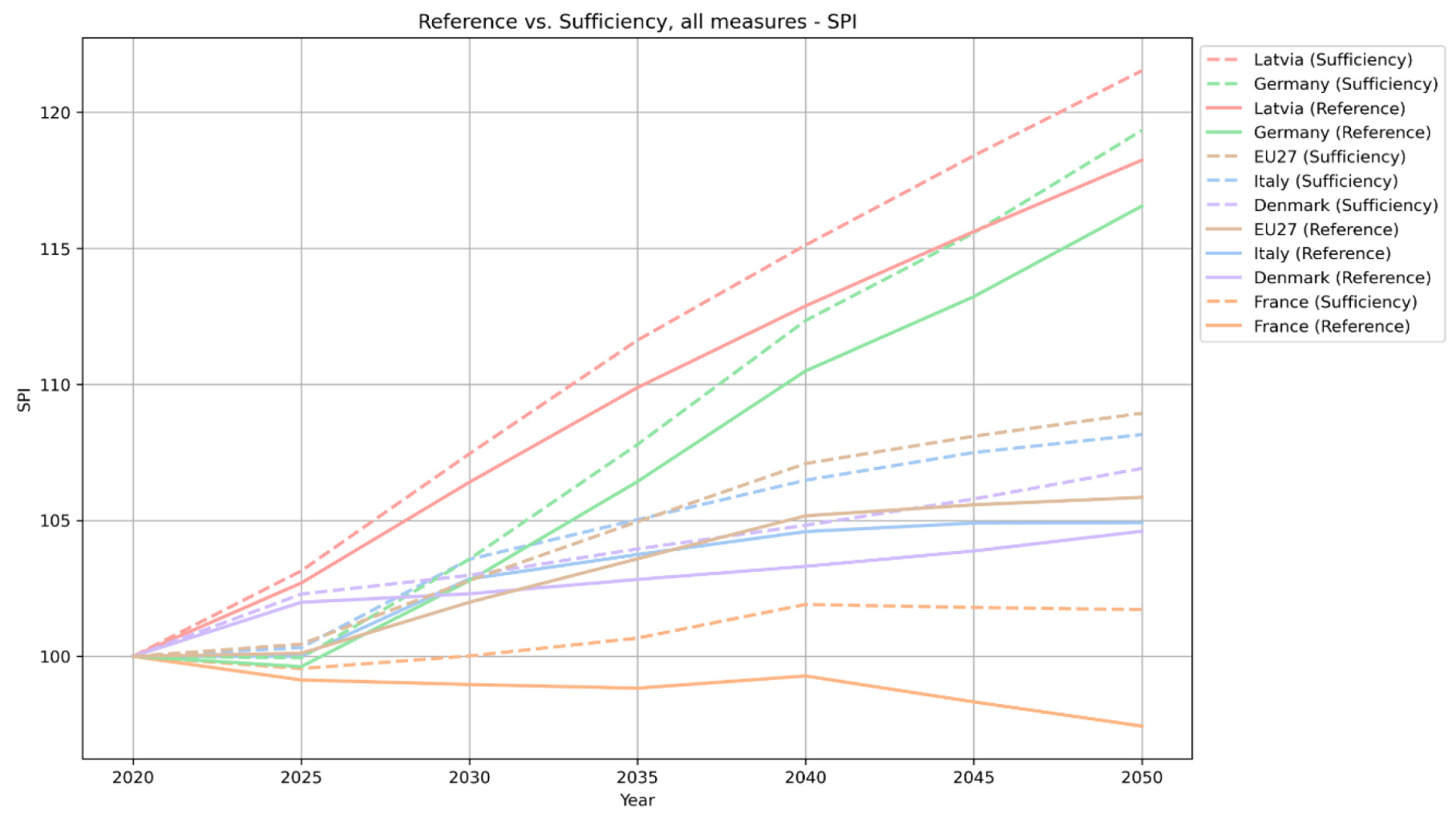 For France, Germany, Italy, and Latvia, the Sufficiency Scenario generally shows slightly high-er SPI values compared to the Reference Scenario throughout the forecast period. For these countries, both scenarios exhibit similar trends and patterns of fluctuation, suggesting that SMs slightly impact SPI compared to the reference case.