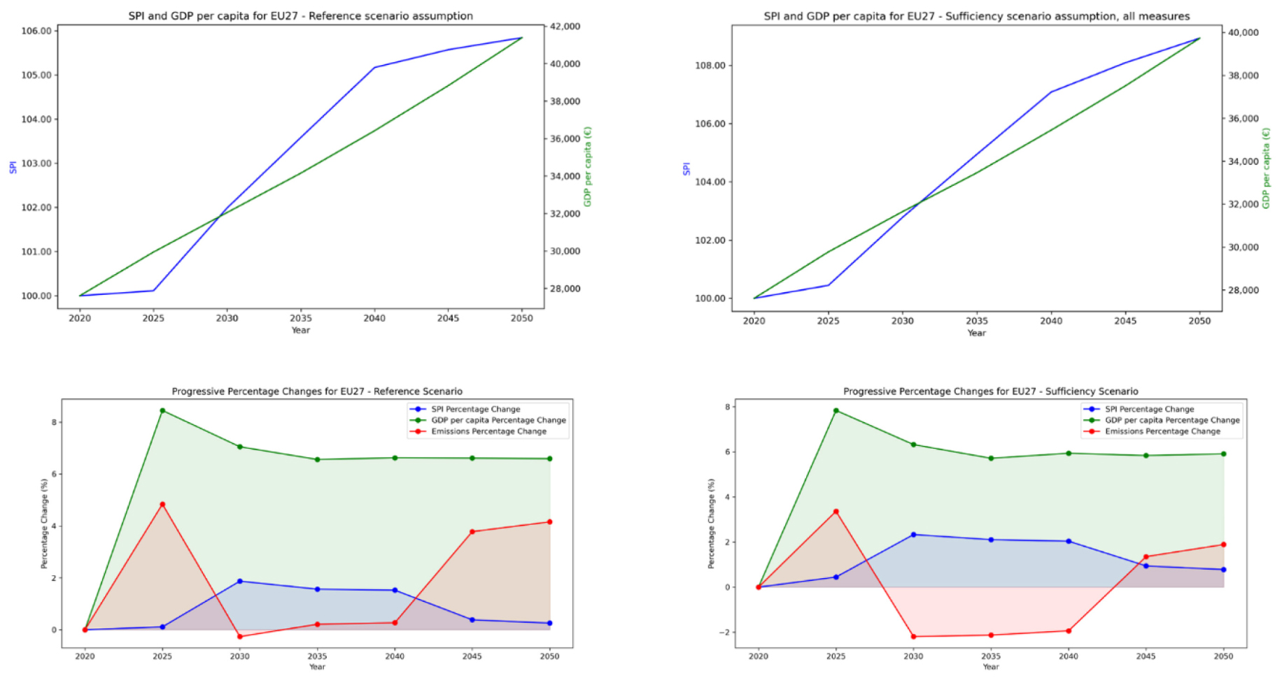 Under the Sufficiency Scenario, the SPI for the EU27 would display values that, on average, would be 1.59% higher compared to the Reference Scenario’s resulting SPI. In 2050, GHG emissions under the Sufficiency Scenario would be 11.8% lower compared to the Reference Scenario, highlighting a significant improvement under the environmental performance. Economic indicators such as GDP per capita and employment/population ratio still grow, but less dramatically, indicating a balanced approach towards sustainability and prosperity.